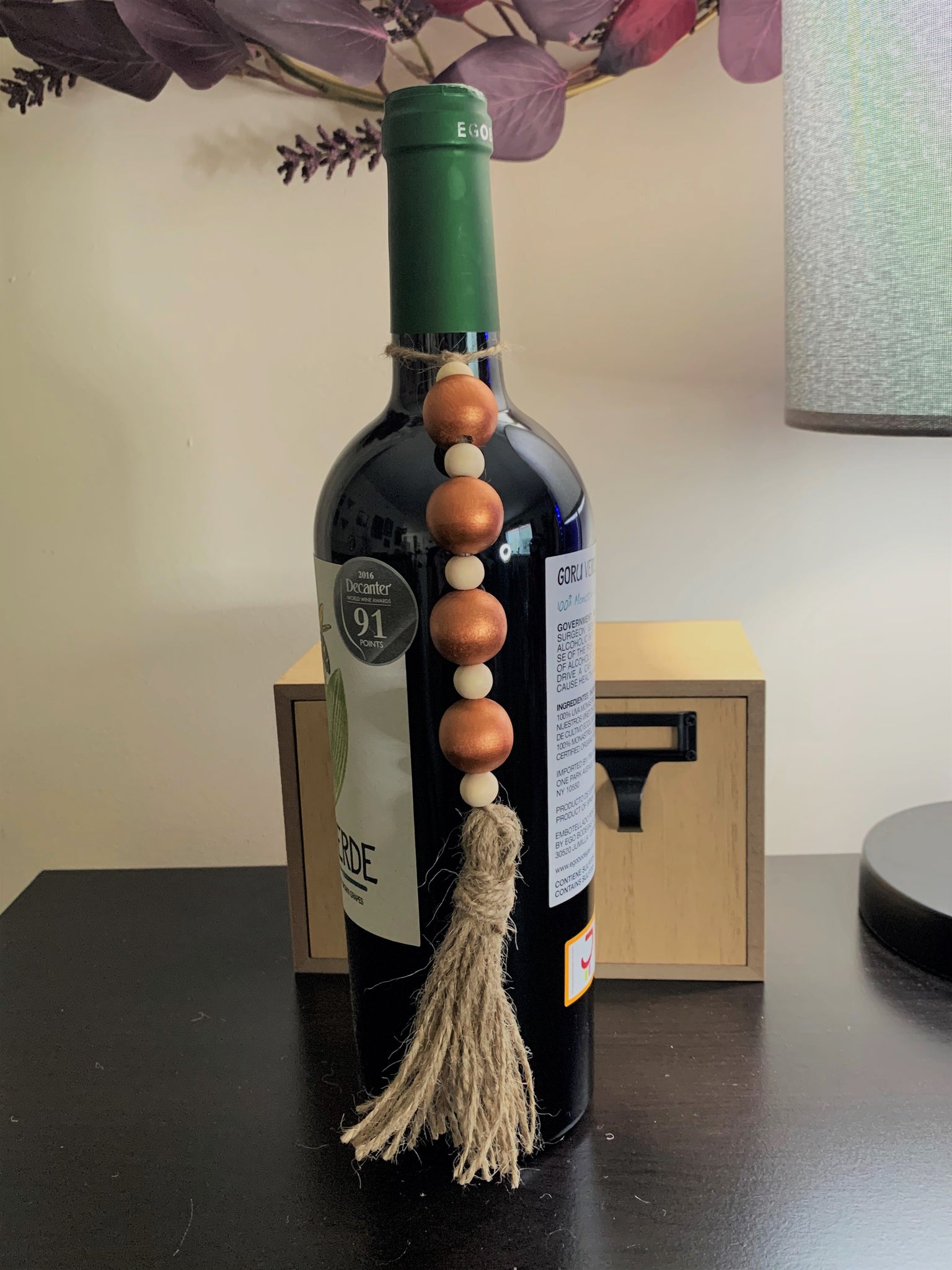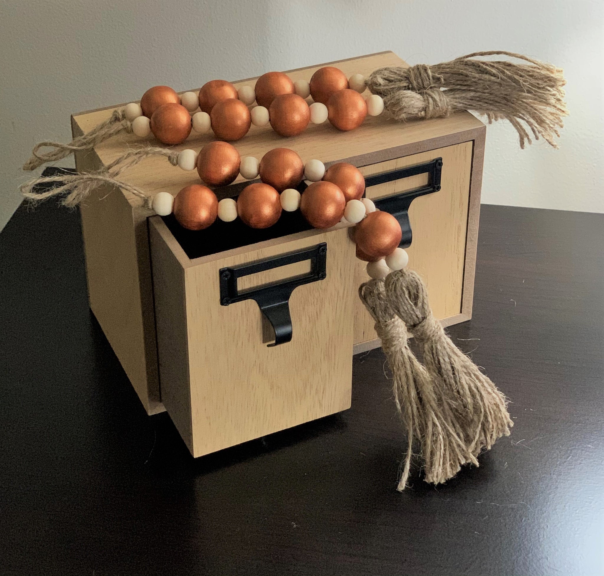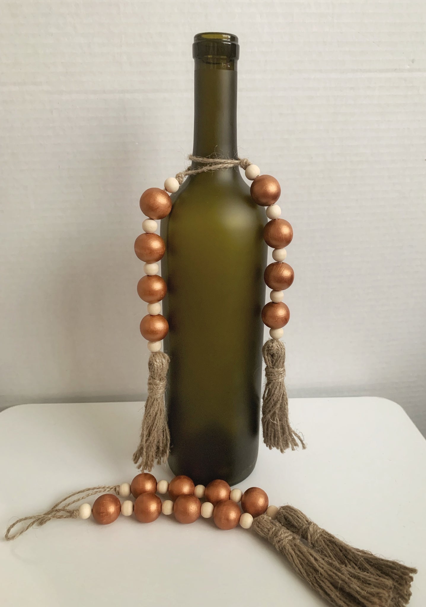Hand painted copper wooden beads and natural wooden beads on a natural jute rope.