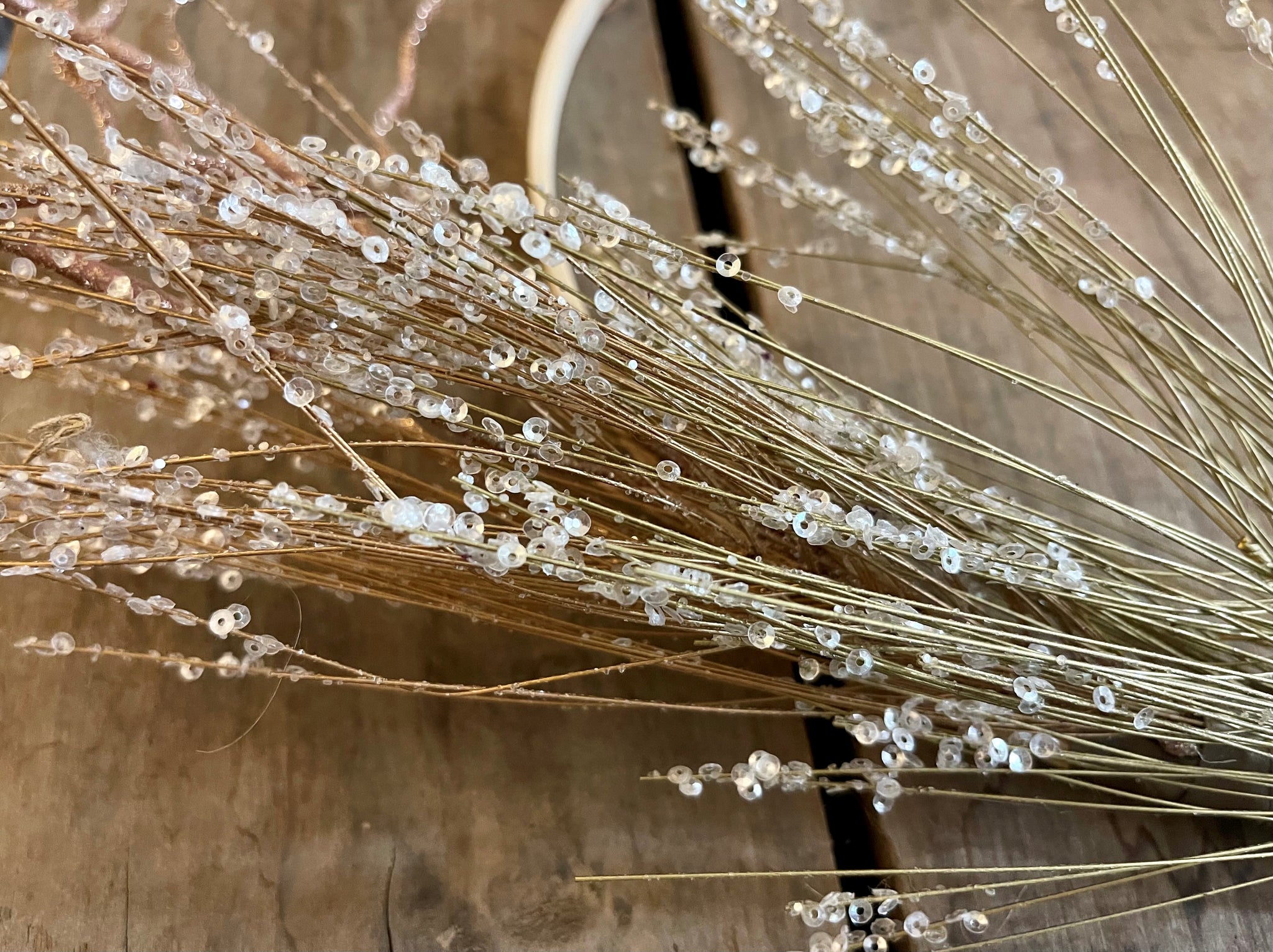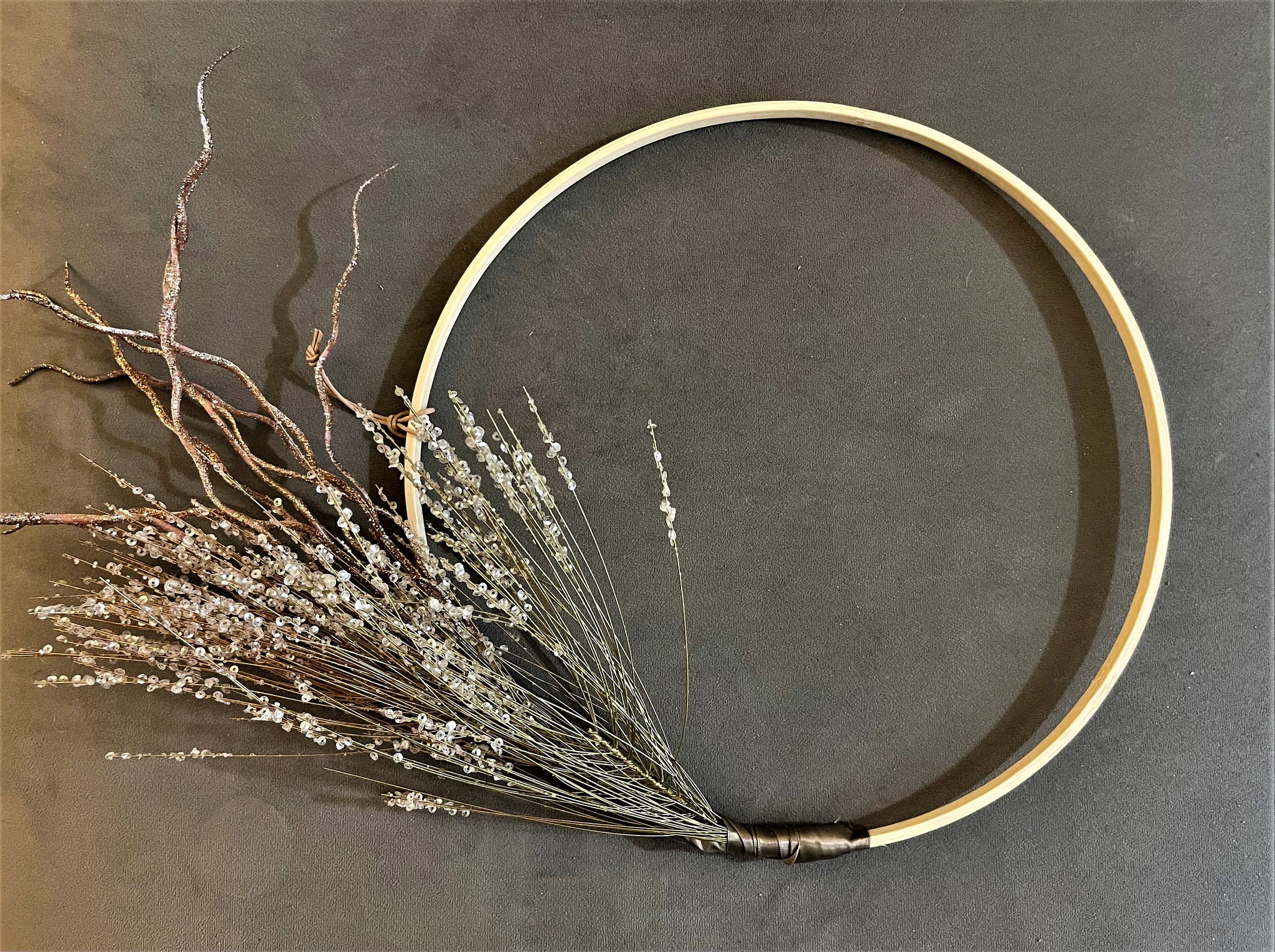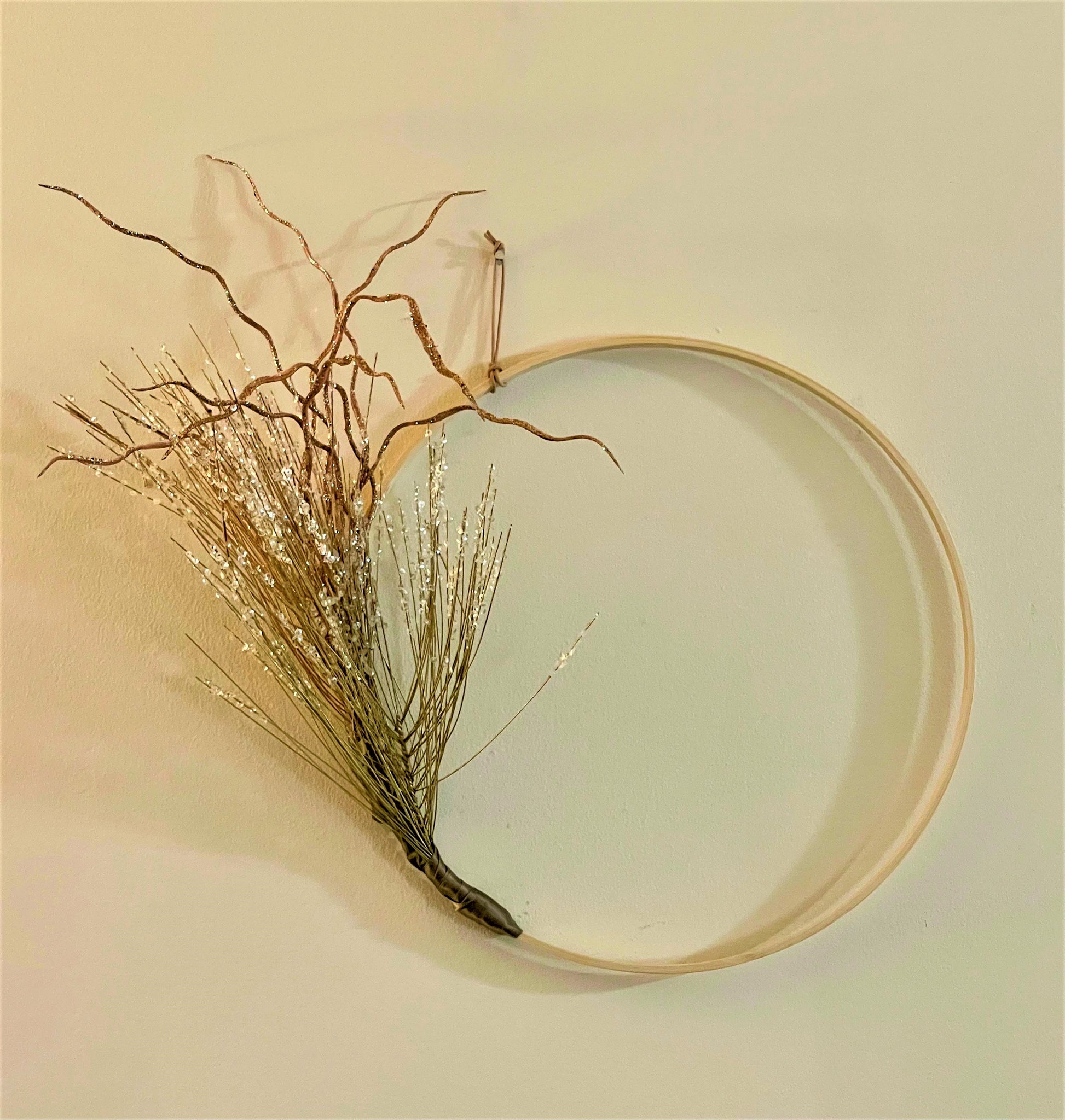 Boho Christmas wreath made with a wood hoop wreath and adorned with rose gold and gold metal and plastic stems. Has a leather loop for hanging.