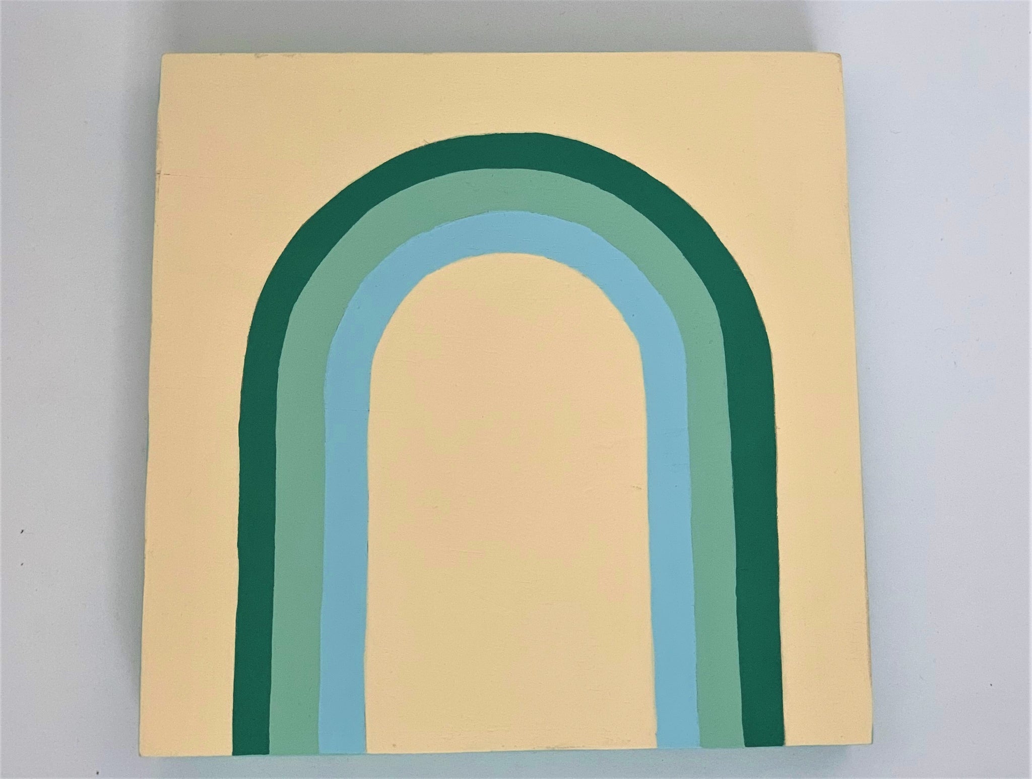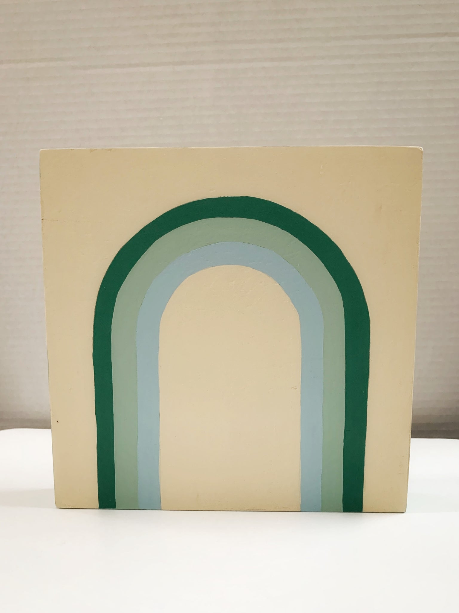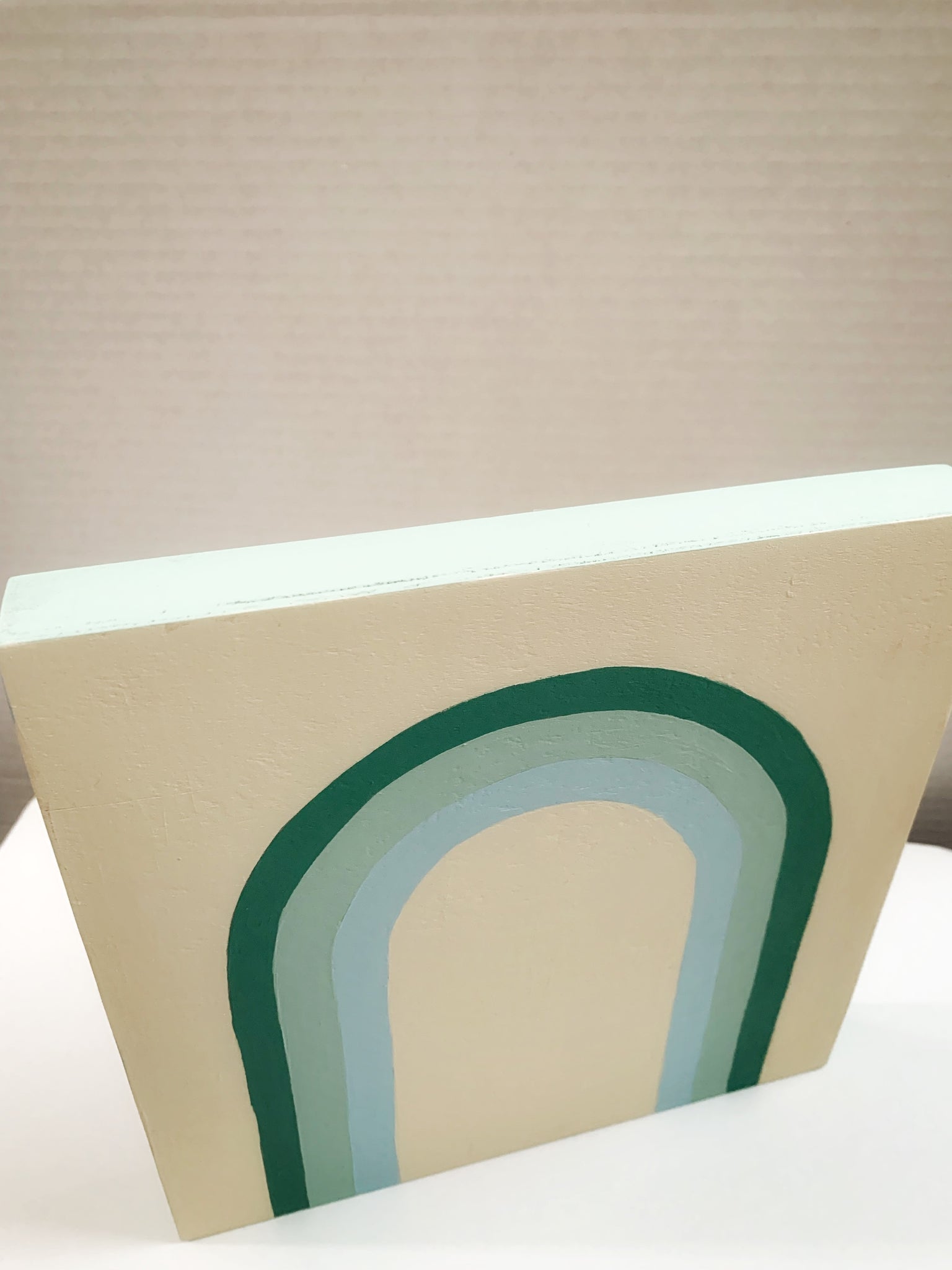 Hand painted by me, rainbow on wood plaque measures 8"x8" and 3" deep.