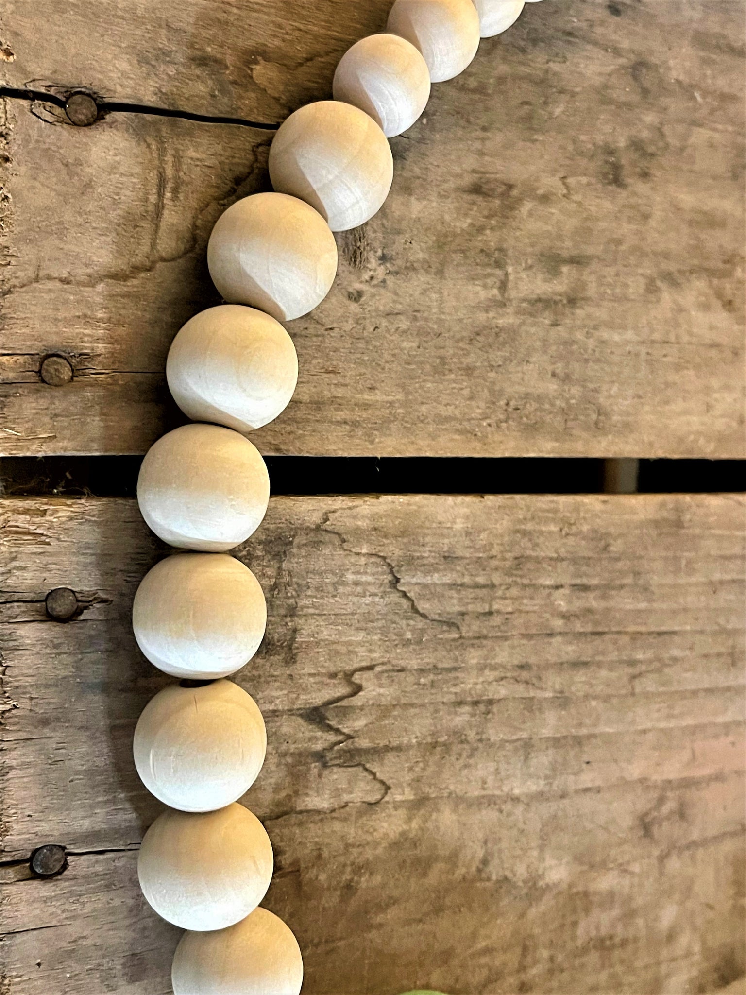 This beautiful wreath is made with wooden beads that at the bottom start off large and gradually get smaller towards the top.