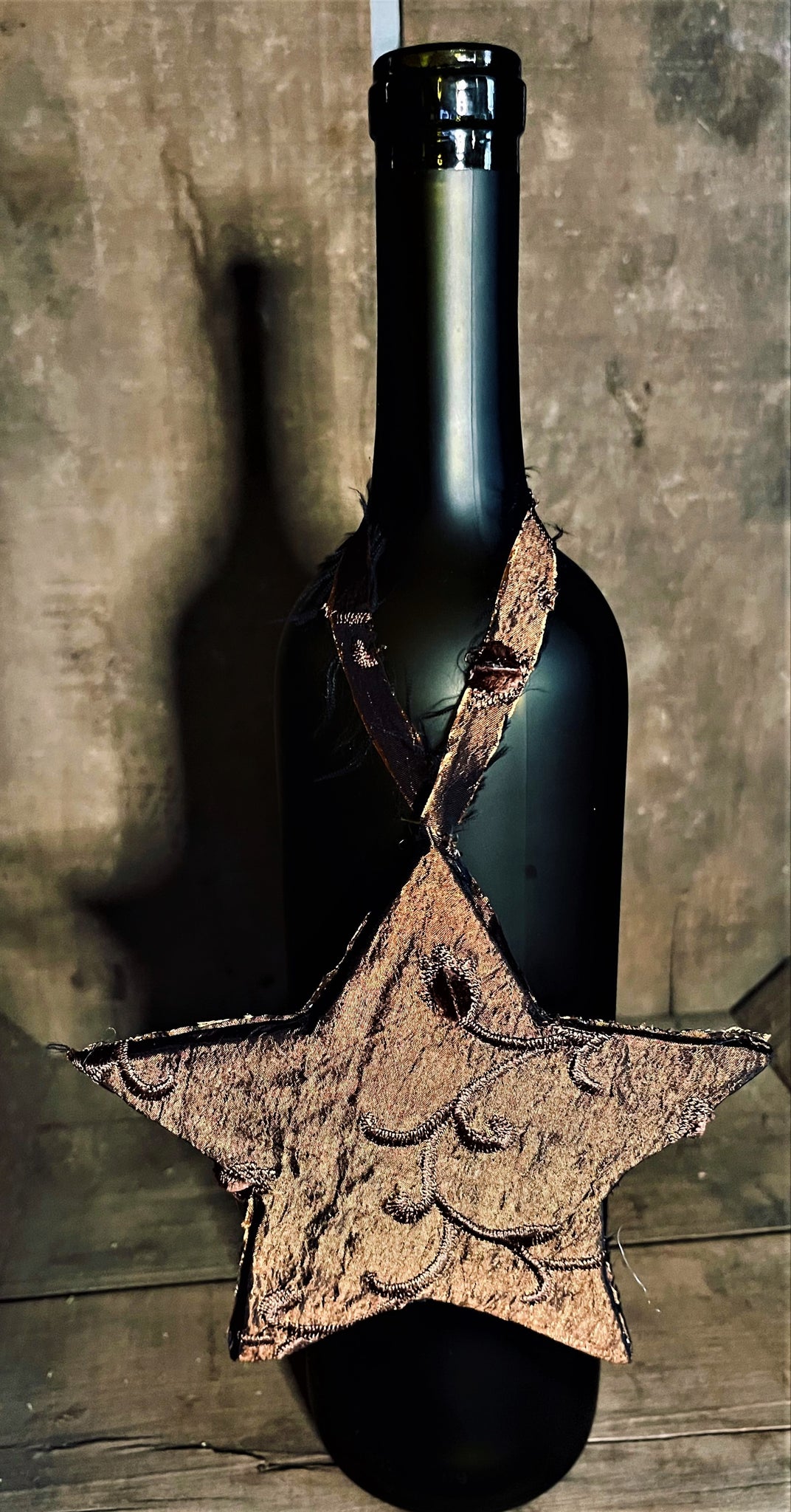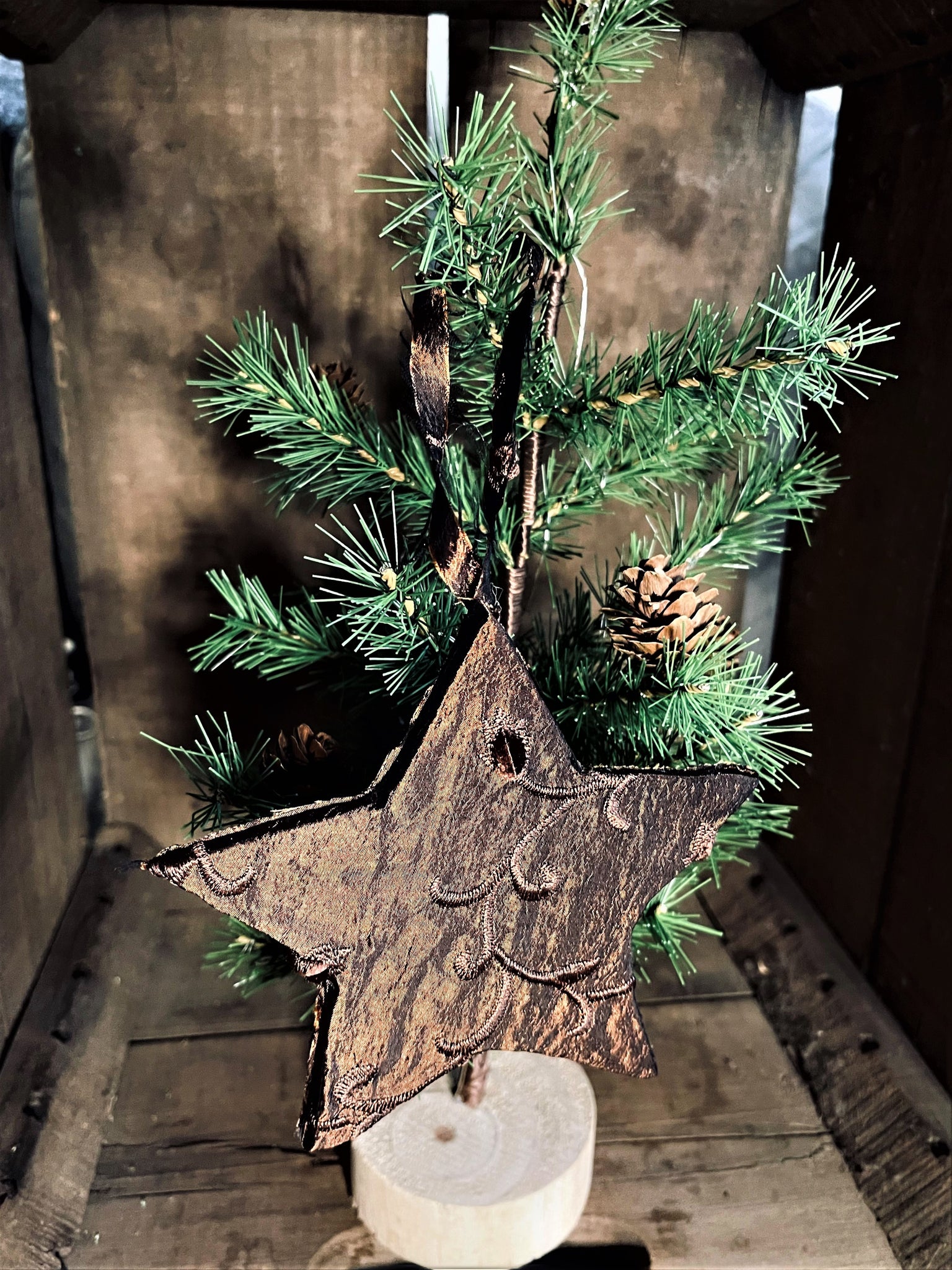 These stars are a beautiful addition to a tree. They are made with a foam board insert with a acrylic blend brown silk acrylic blend fabric the loop for hanging is made of the same material.