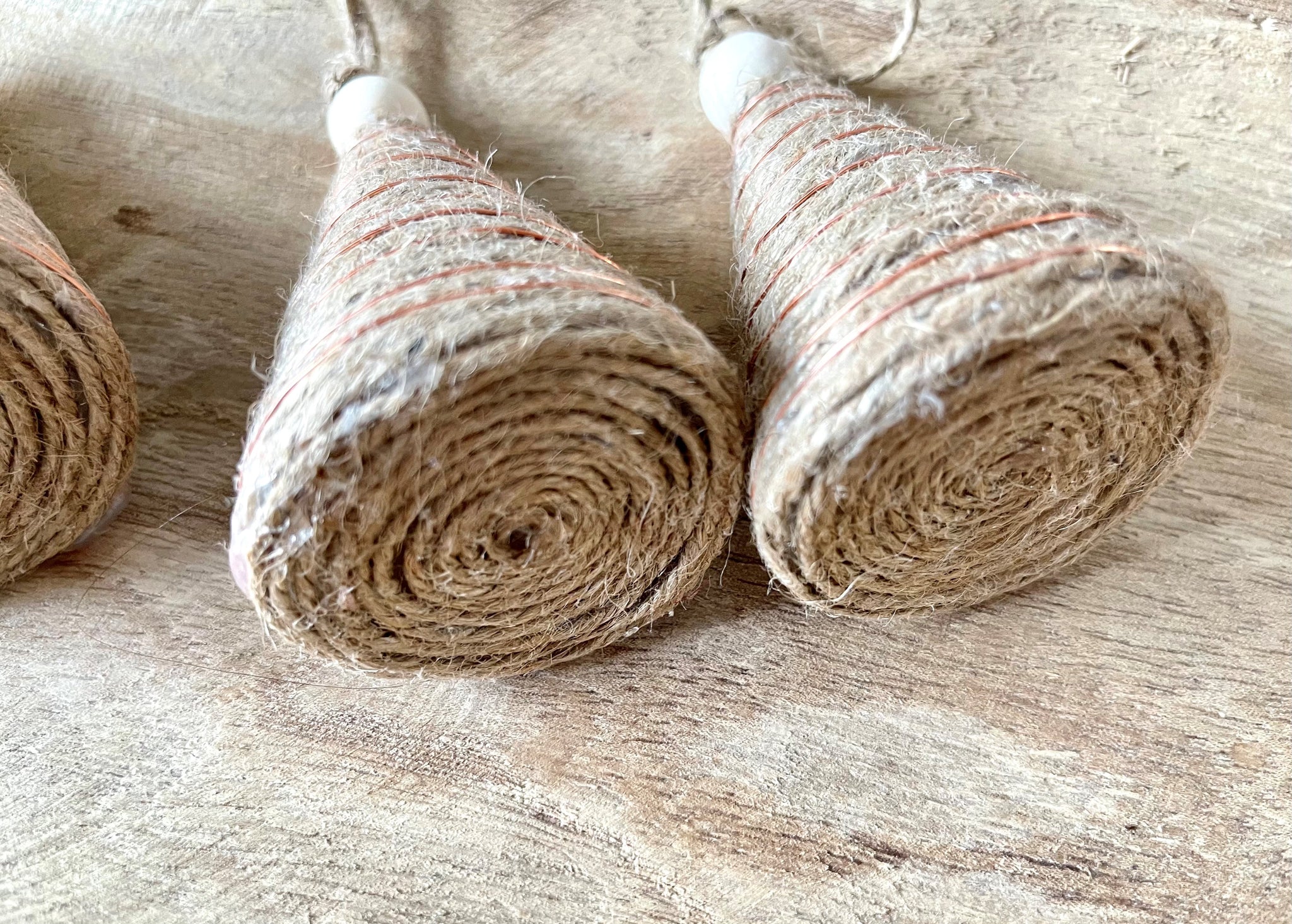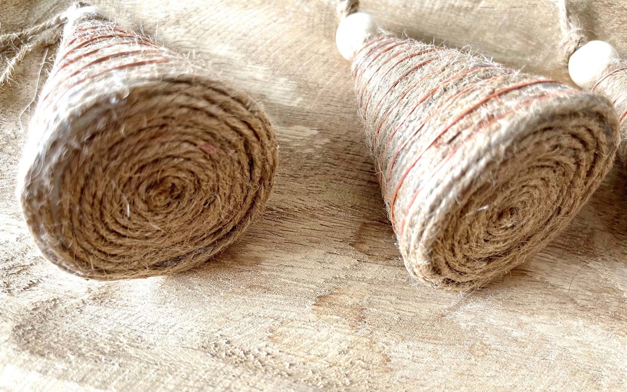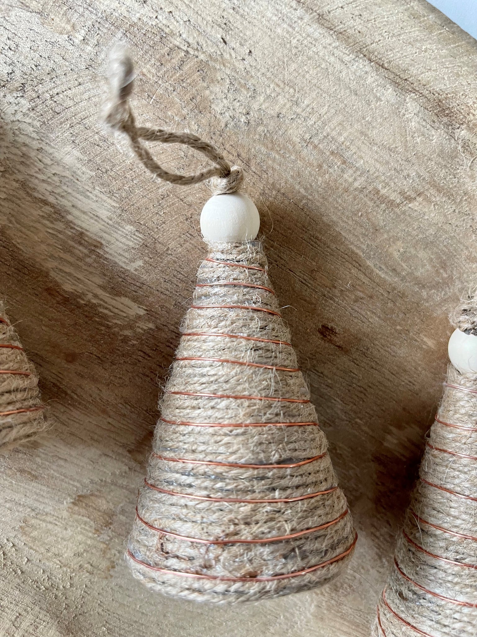 Tree shaped ornaments are wrapped in rope and copper colored wire. The tree is topped with a wood bead.