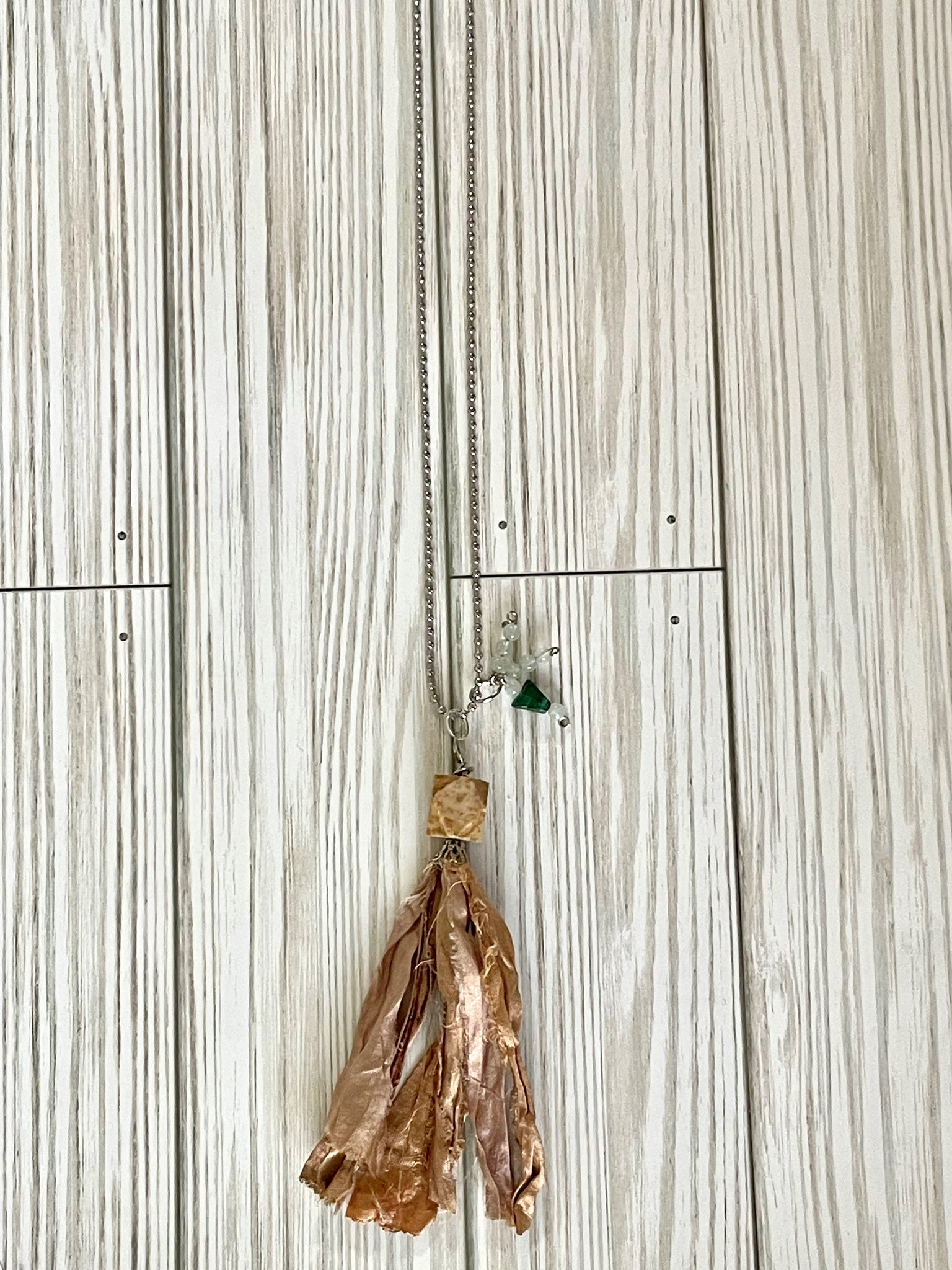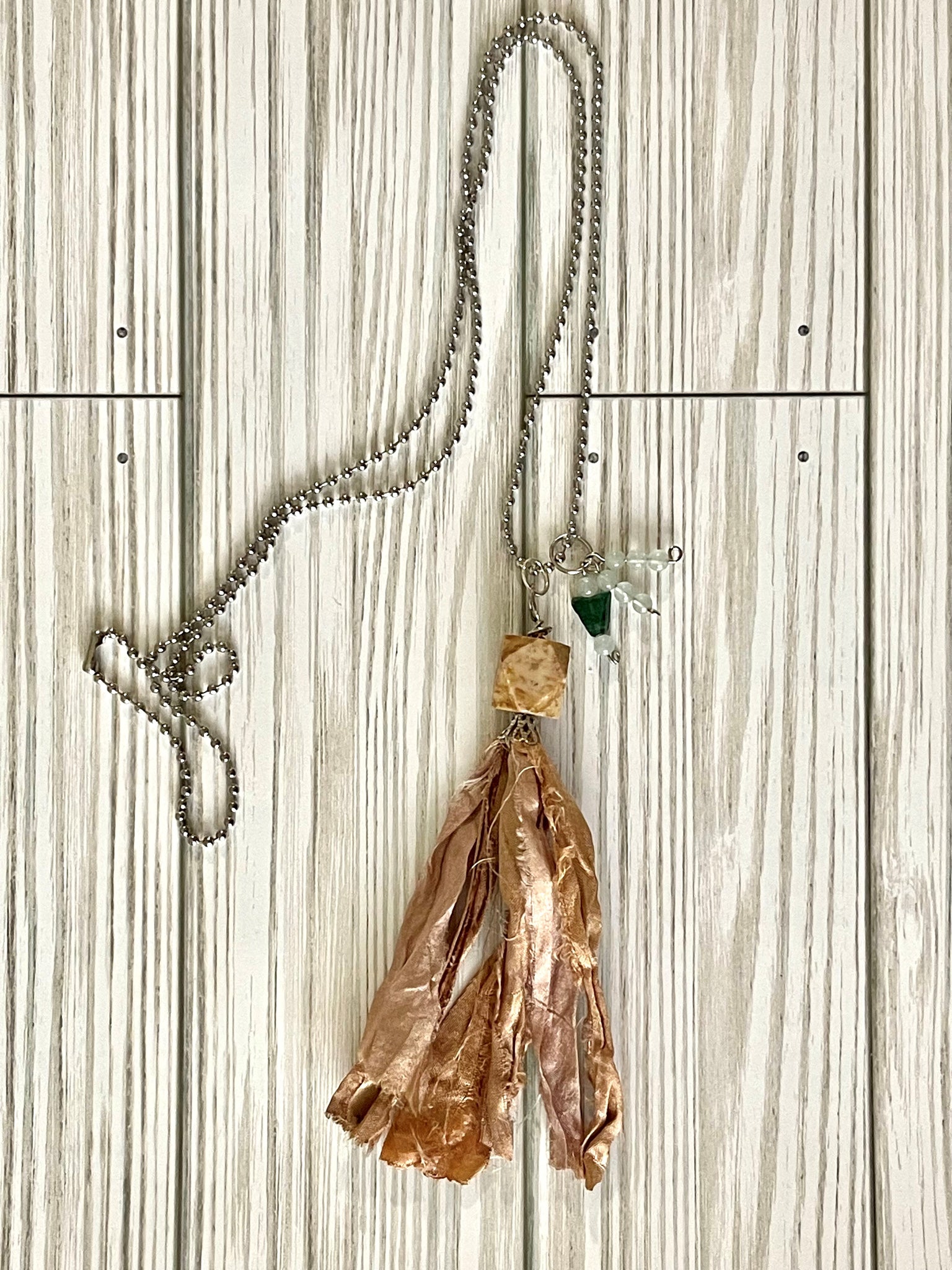 Tassel measures 5” long and stainless steel ball chain necklace is 15” long when wearing.