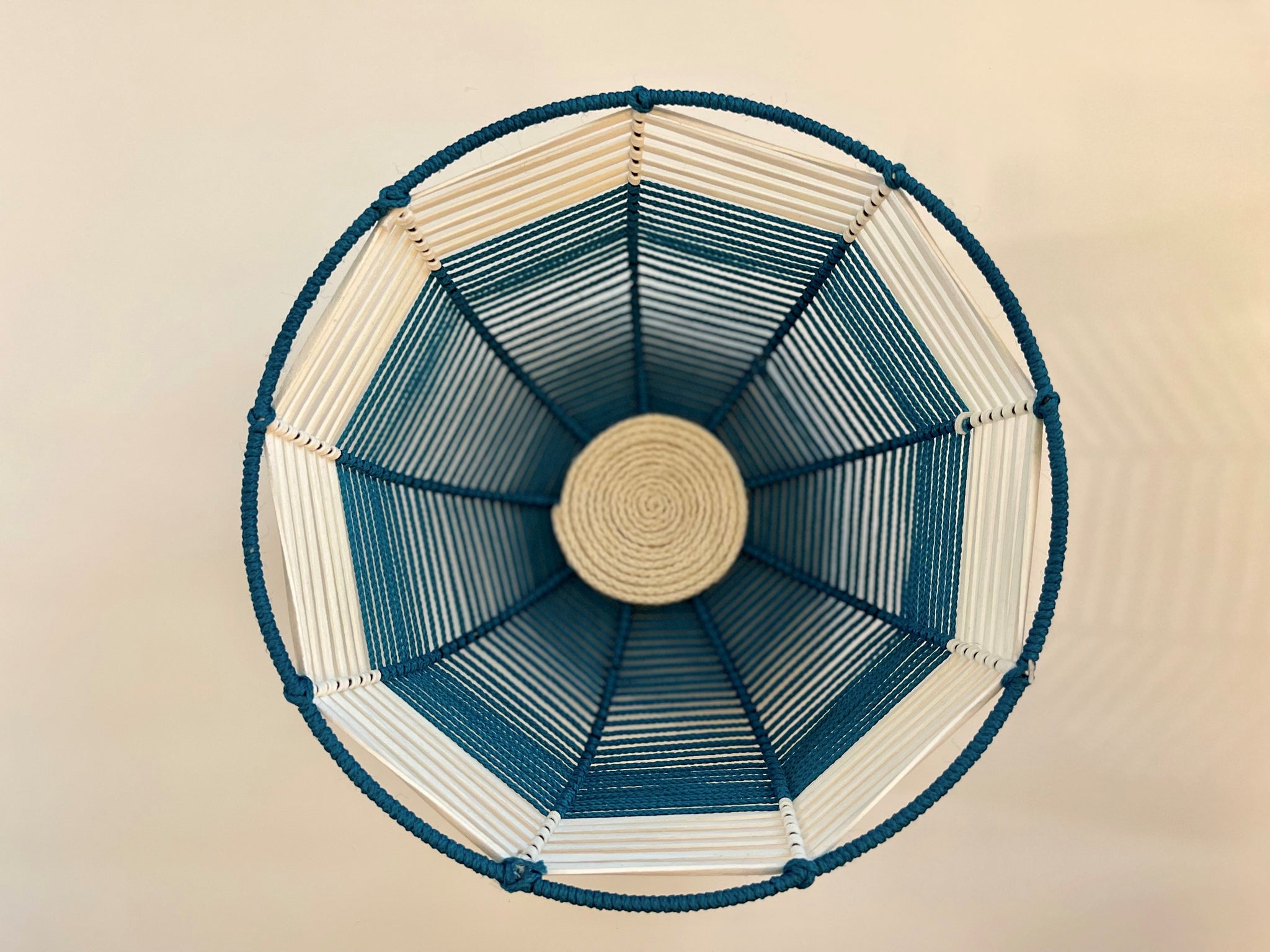 Large hand woven bowl makes a great centerpiece measures 10" wide and 4.5" tall. Made with nylon rope, faux leather cord and a metal frame, very lightweight.