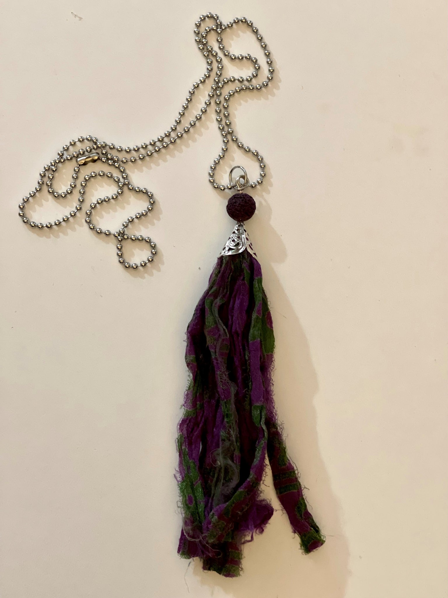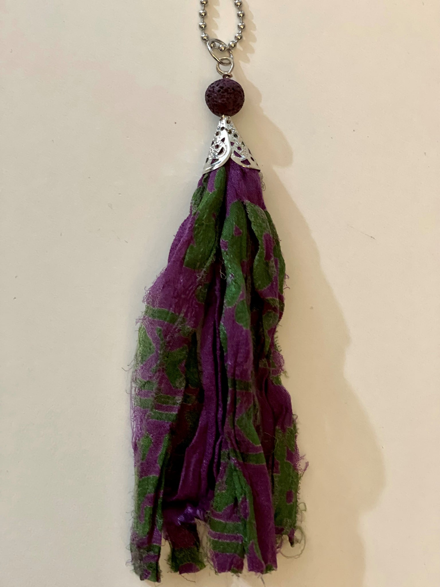 Purple and green silk tassel necklace with lava stone bead