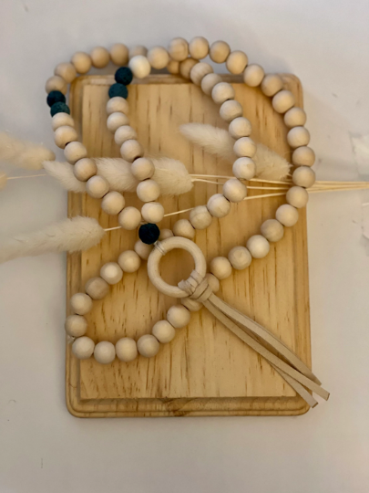 Necklace is 19.75 inches in total length with the tassel, tassel is 4.50 in length. Natural wood beads and lava bead are strung on a hemp cord. Tassel is made with a natural wood and faux leather. Necklace is lightweight weighing 1.4 ounces.