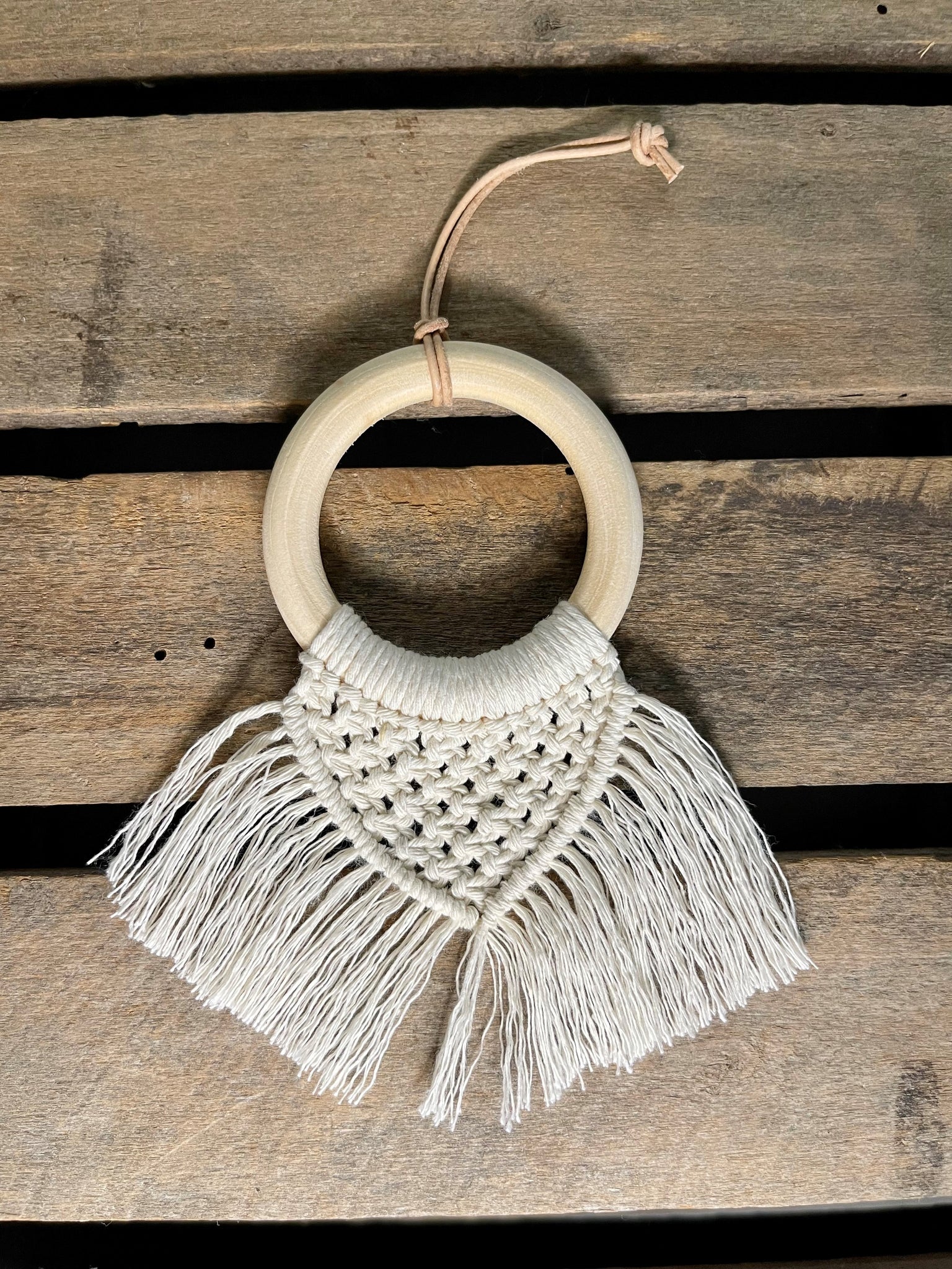 Made from cotton cord and a wooden ring and hung with a cotton cord.