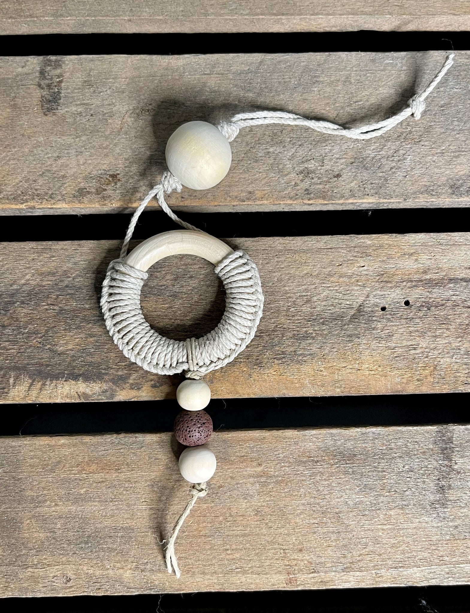 Made with natural wood ring and bead, lava stone for holding oil and hemp string.