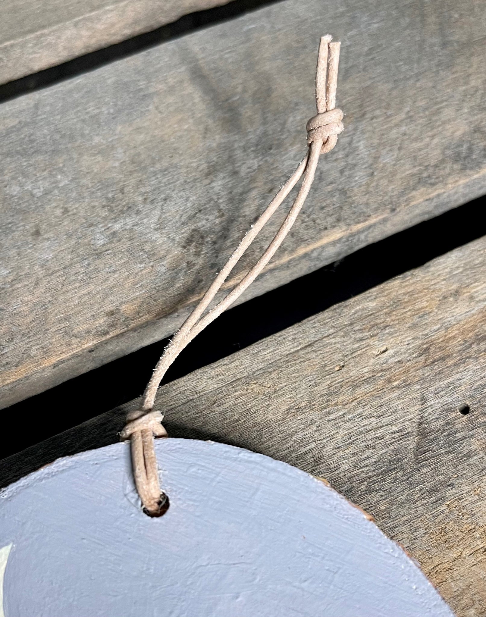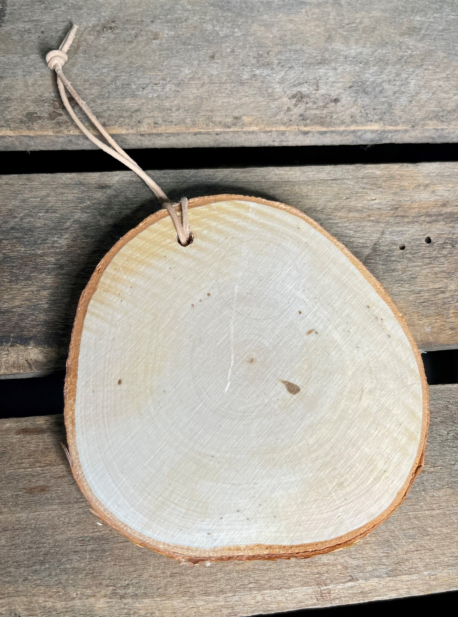 Mountain scene ornament is hand painted birch wood slices with a leather cord for hanging.