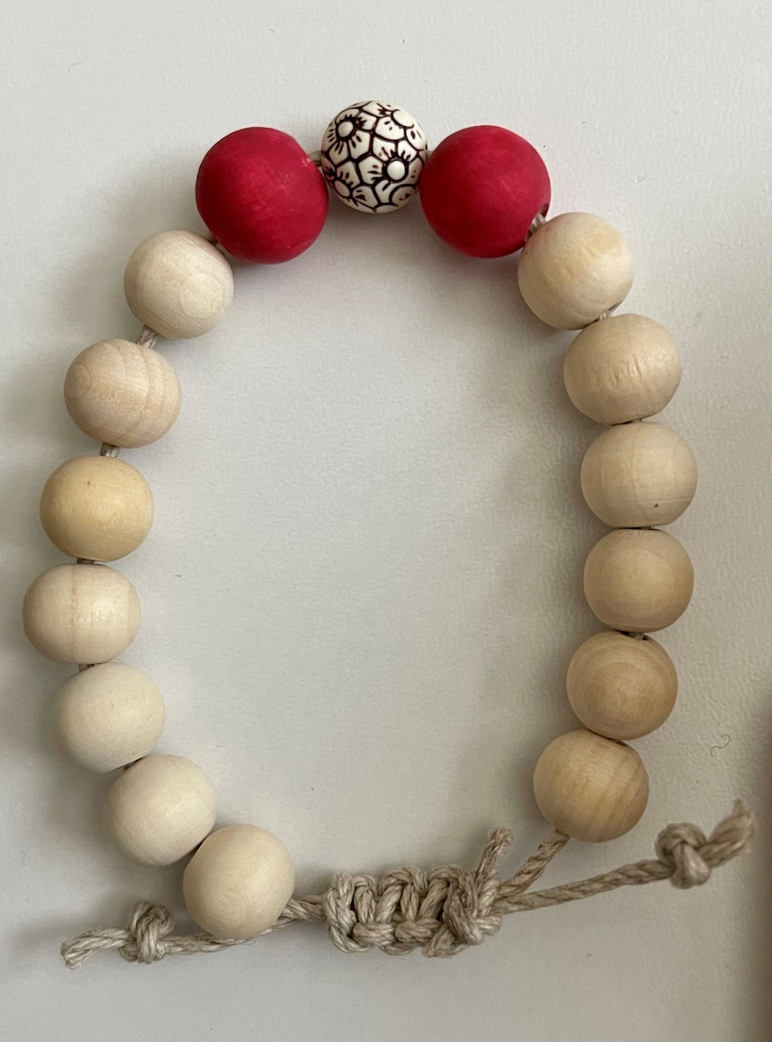 Handmade bracelet with 16mm natural beads, 20mm hand dyed wood beads and 1 plastic flower bead. Bracelets fit 12 to 8 inch round wrists with the adjustable slip knot.