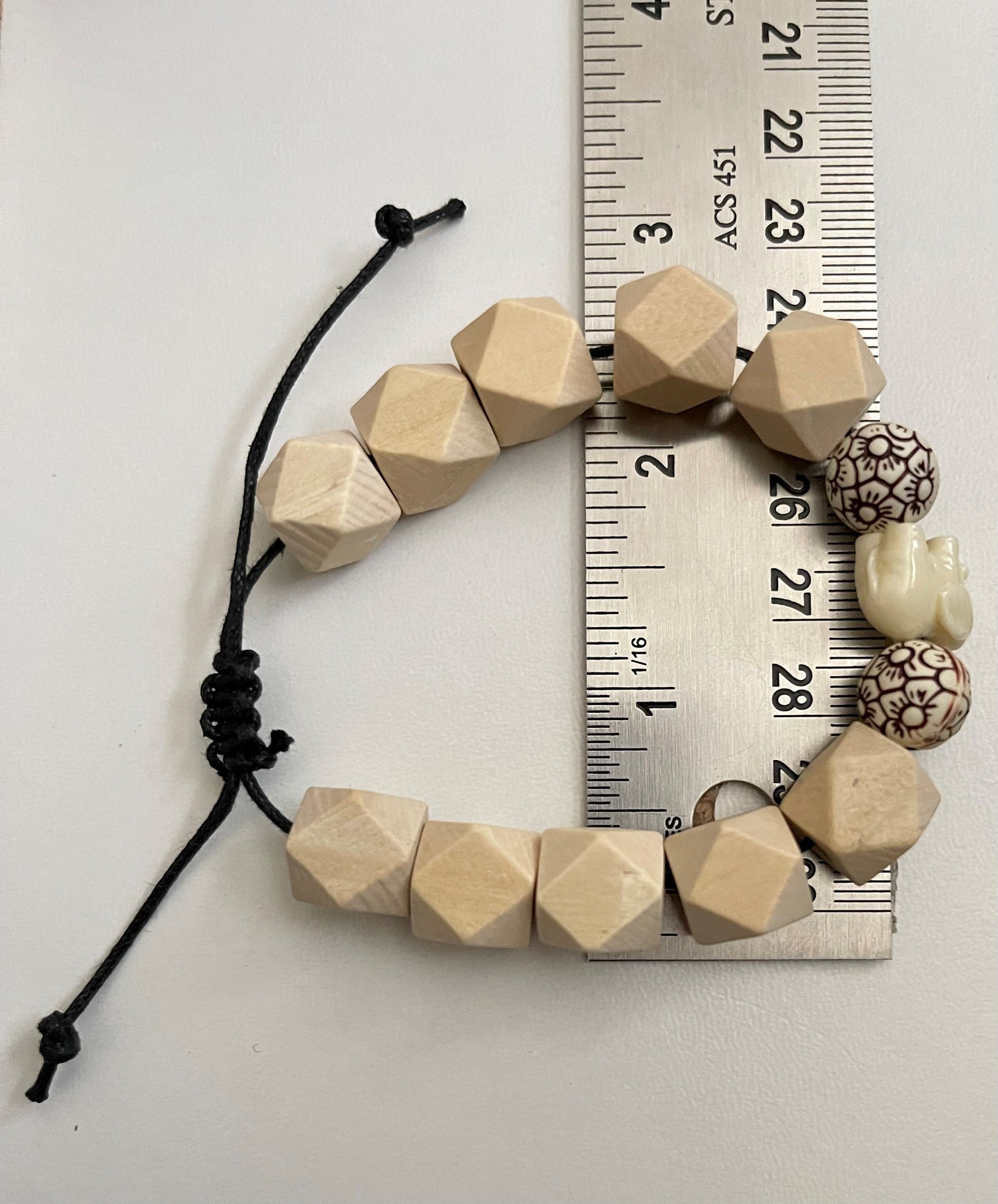 Handmade bracelet with 10mm natural wood beads, 9mm plastic flower beads and plastic elephant bead.