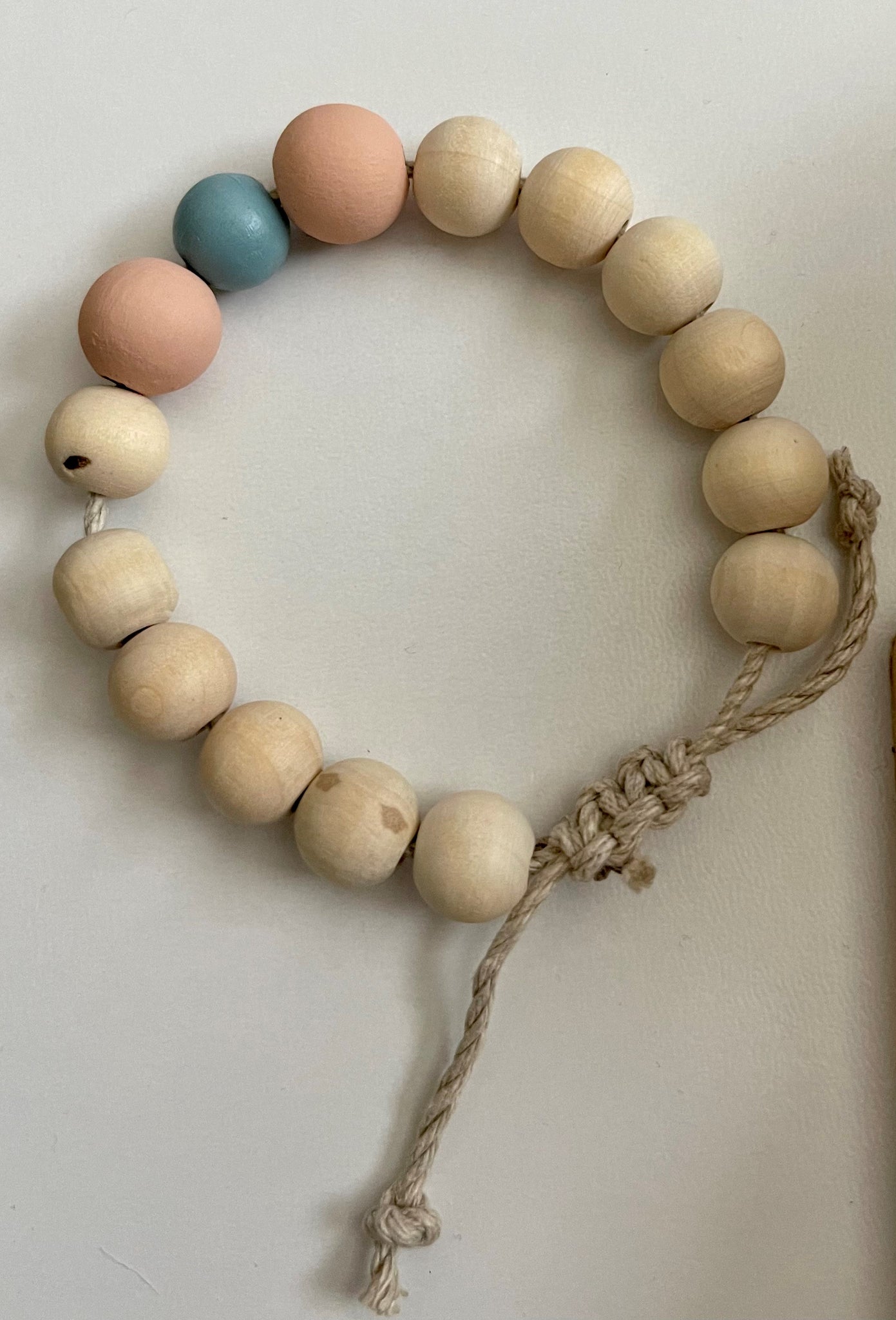 Handmade bracelet with 8mm natural beads and 3 hand painted wood beads. Bracelets fit 12 to 8 inch round wrists with the adjustable slip knot.