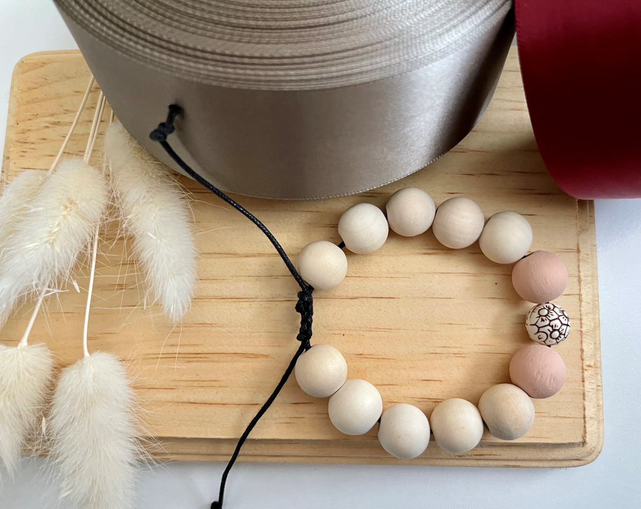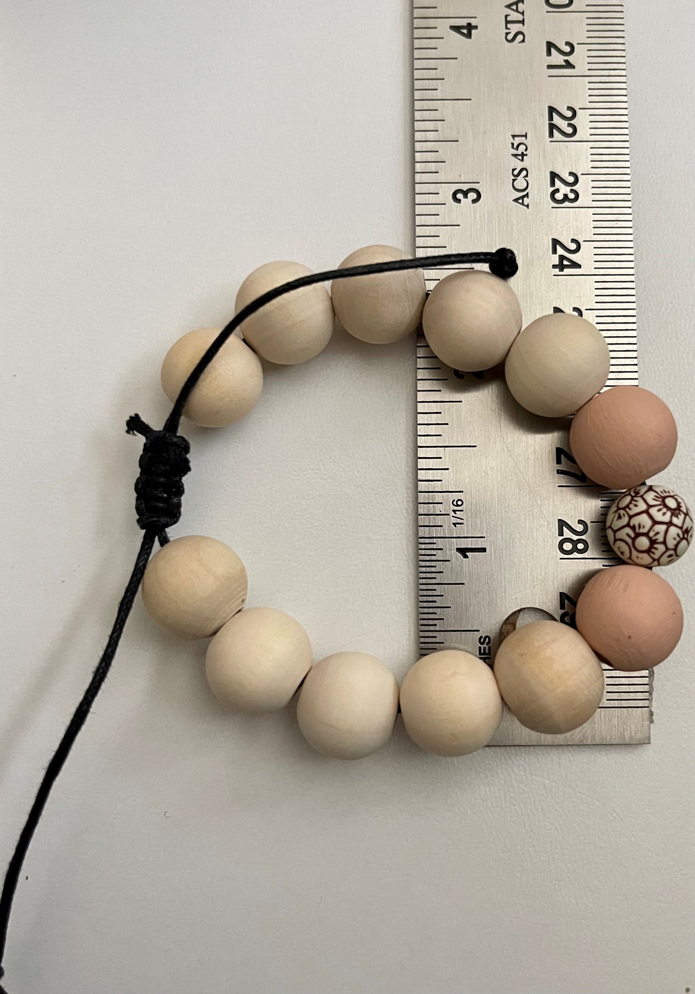 Handmade bracelet with 12mm natural beads and 9mm flower bead. Two pink beads are natural wood bead that has been painted with acrylic paint.