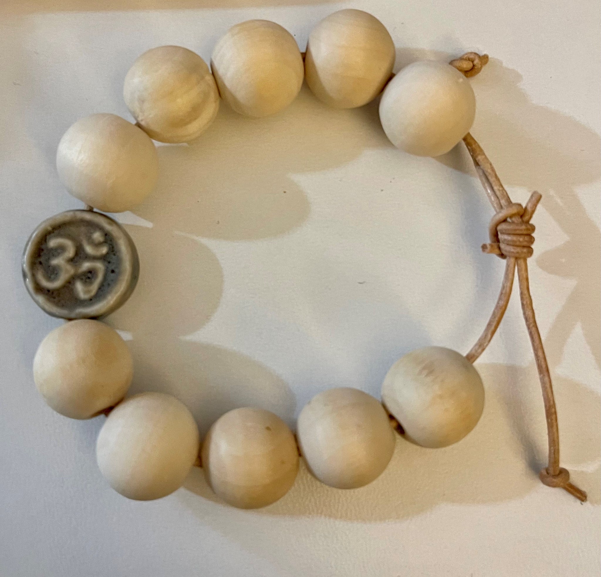 Handmade bracelet with natural wood beads and ceramic ohm bead. Bracelets fit 12 to 8 inch round wrists with the adjustable slip knot.