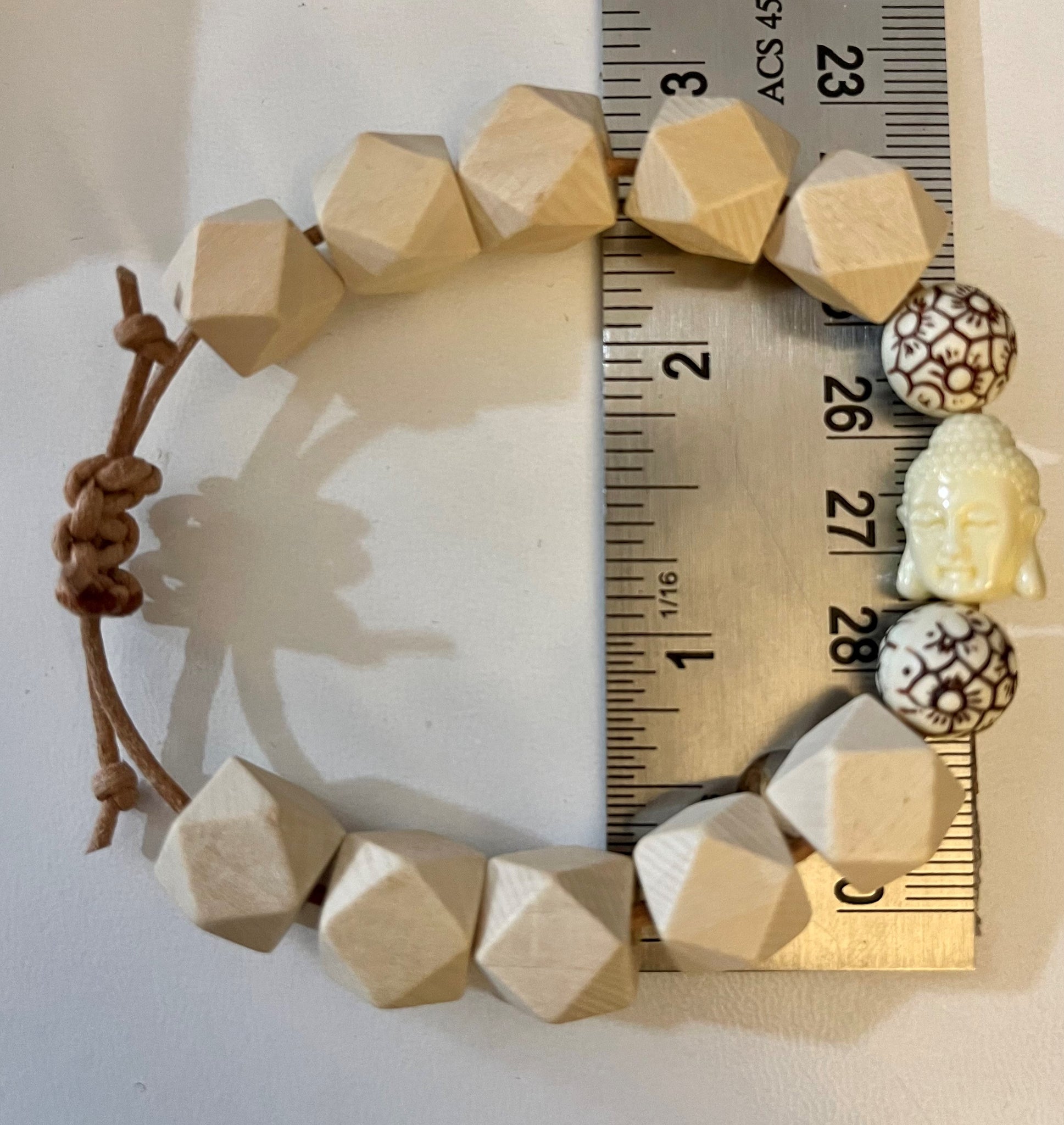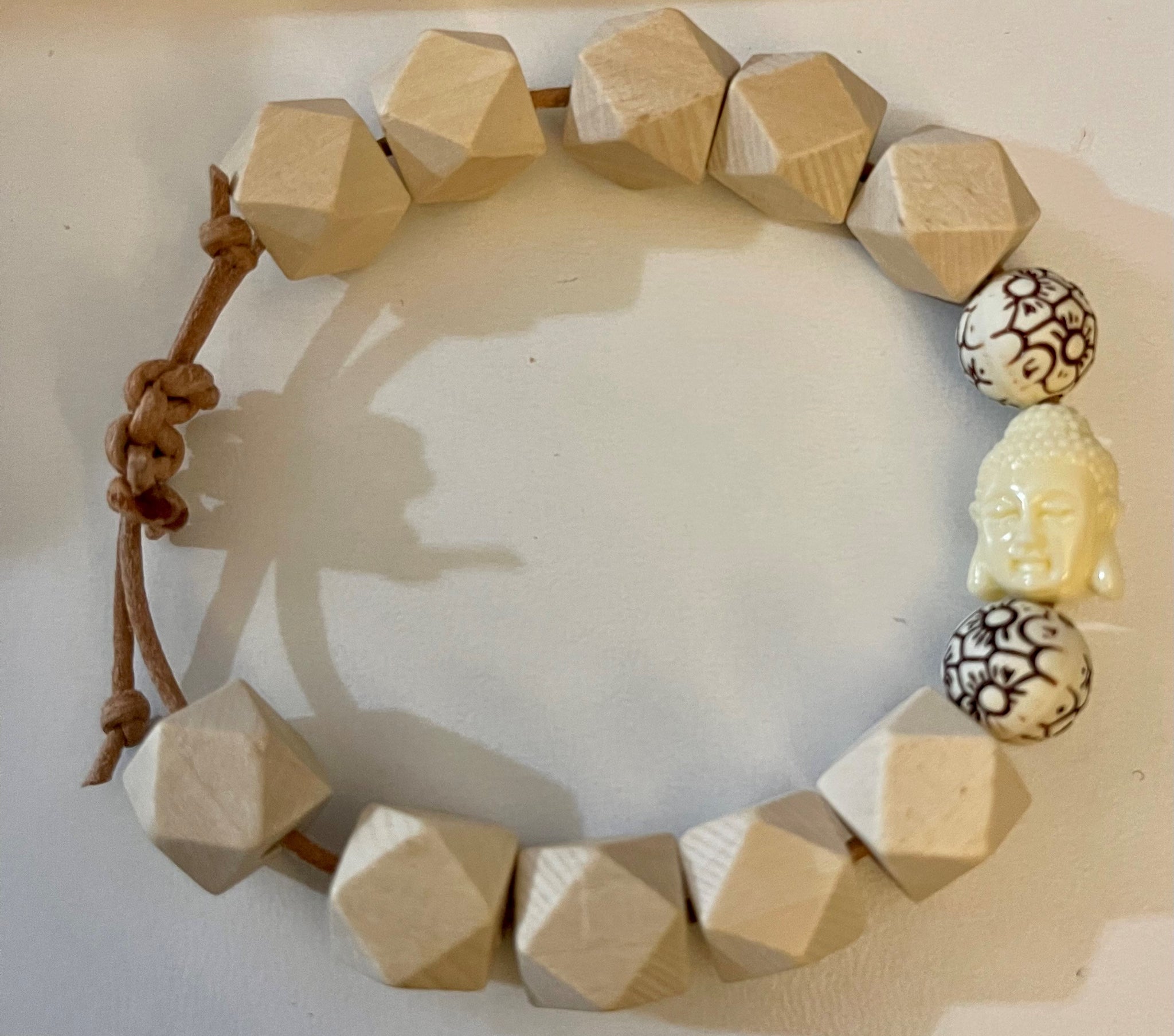 Handmade bracelet with hexagon wood beads, plastic Buddha head bead and plastic flower beads. Bracelets fit 12 to 8 inch round wrists with the adjustable slip knot.