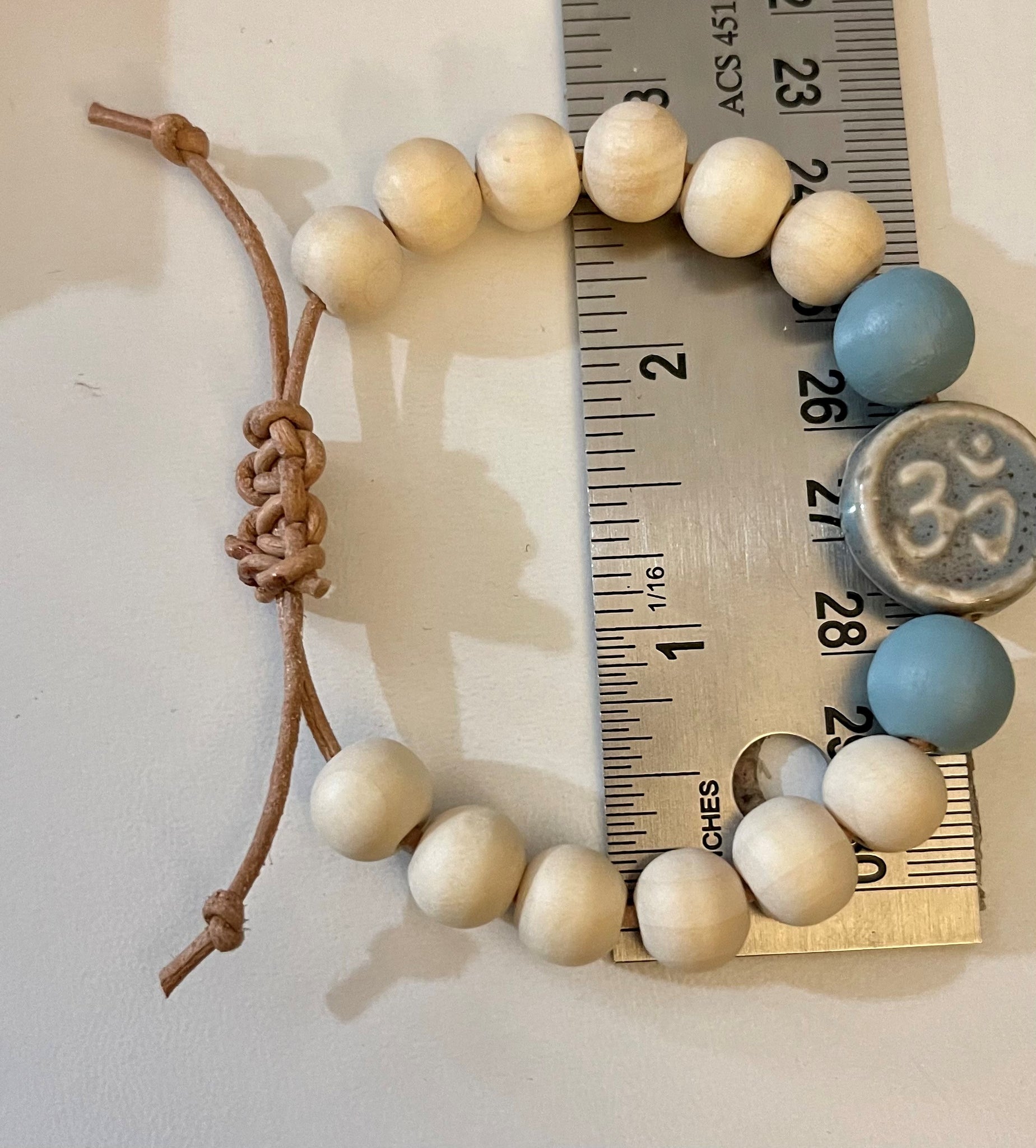 Handmade bracelet with 8mm natural beads, 20mm hand painted wood beads and a ceramic ohm bead. Bracelets fit 12 to 8 inch round wrists with the adjustable slip knot.