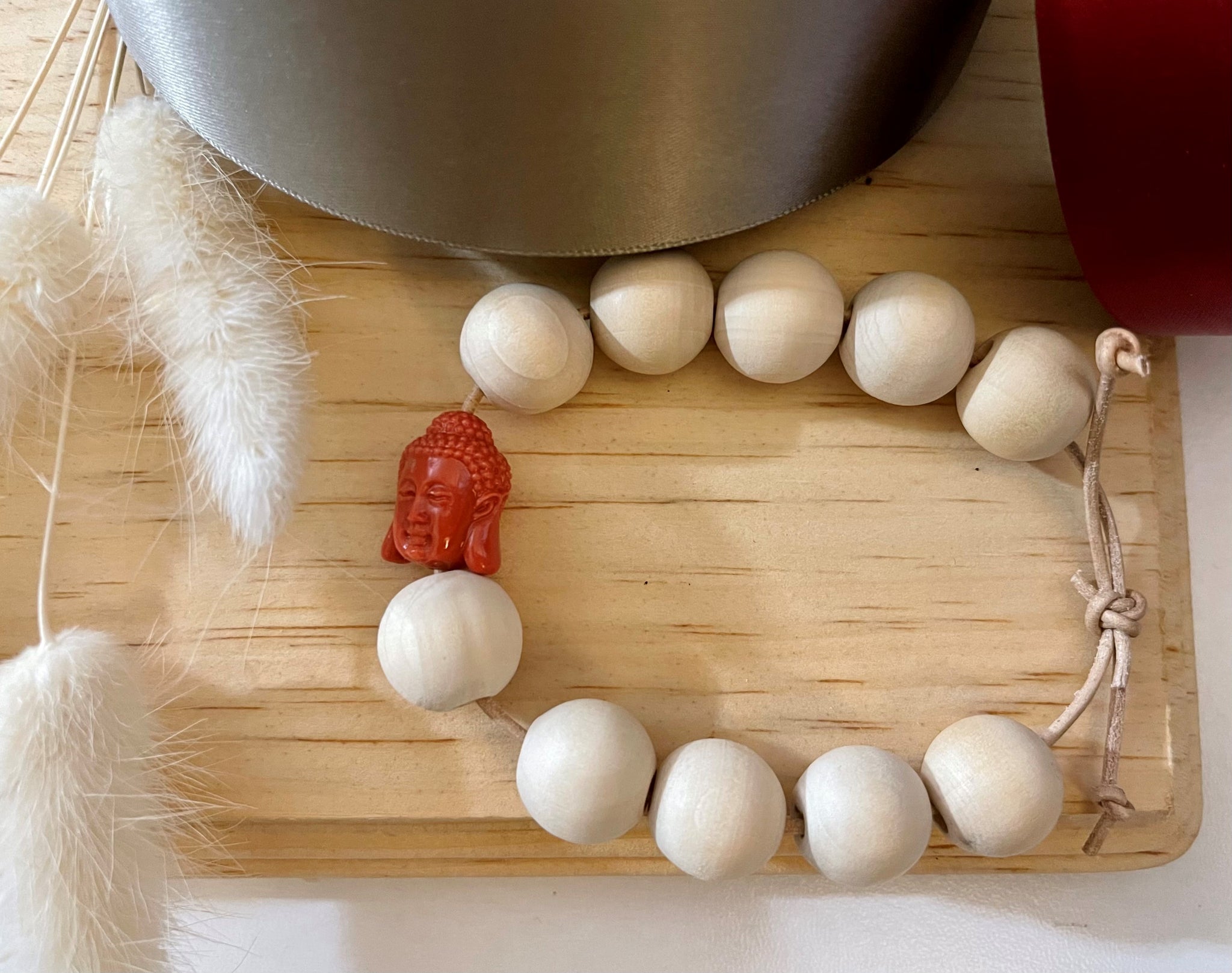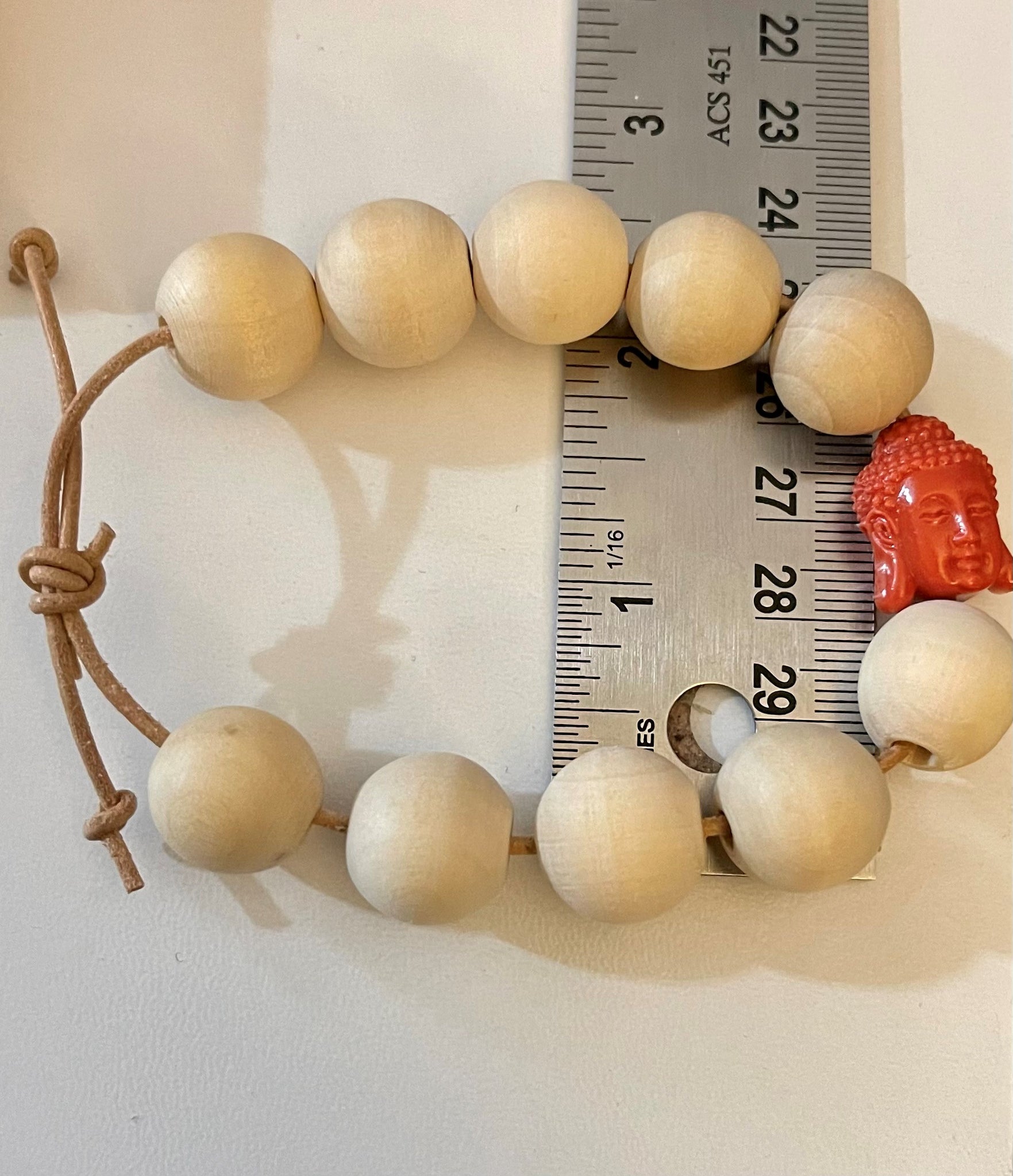 Handmade bracelet with natural wood beads and plastic Buddha bead. Bracelets fit 12 to 8 inch round wrists with the adjustable slip knot.
