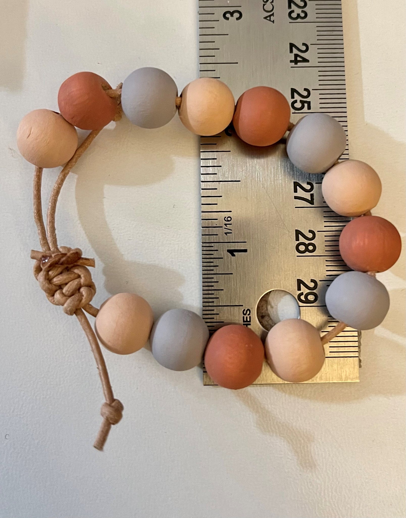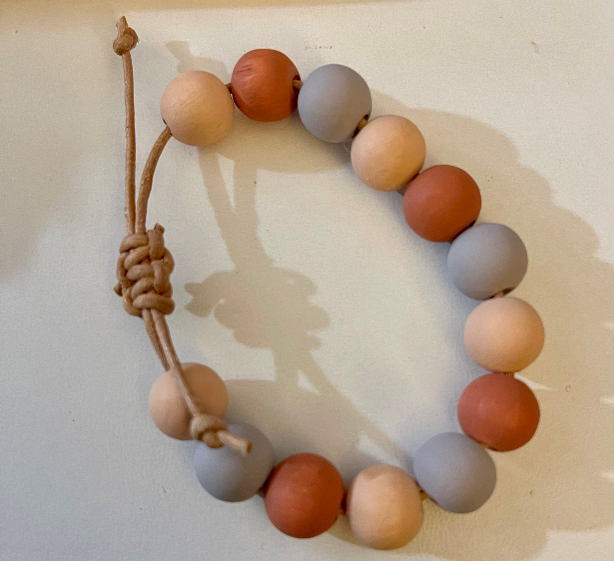 Handmade bracelet with hand painted natural wood beads. Bracelets fit 12 to 8 inch round wrists with the adjustable slip knot.