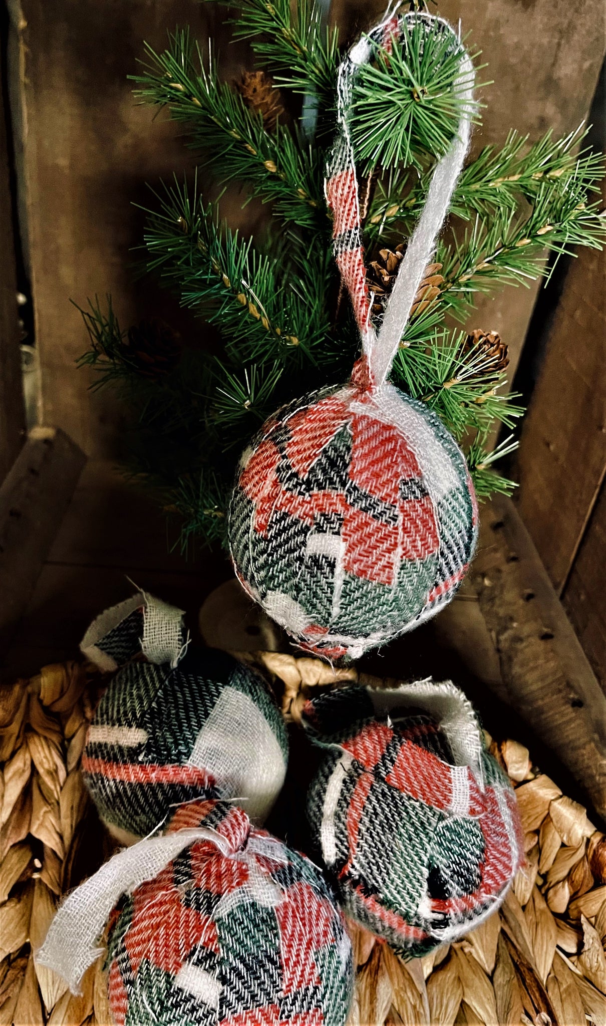 Red plaid Christmas trees balls are 3.5 inches round and are made with a very soft material.