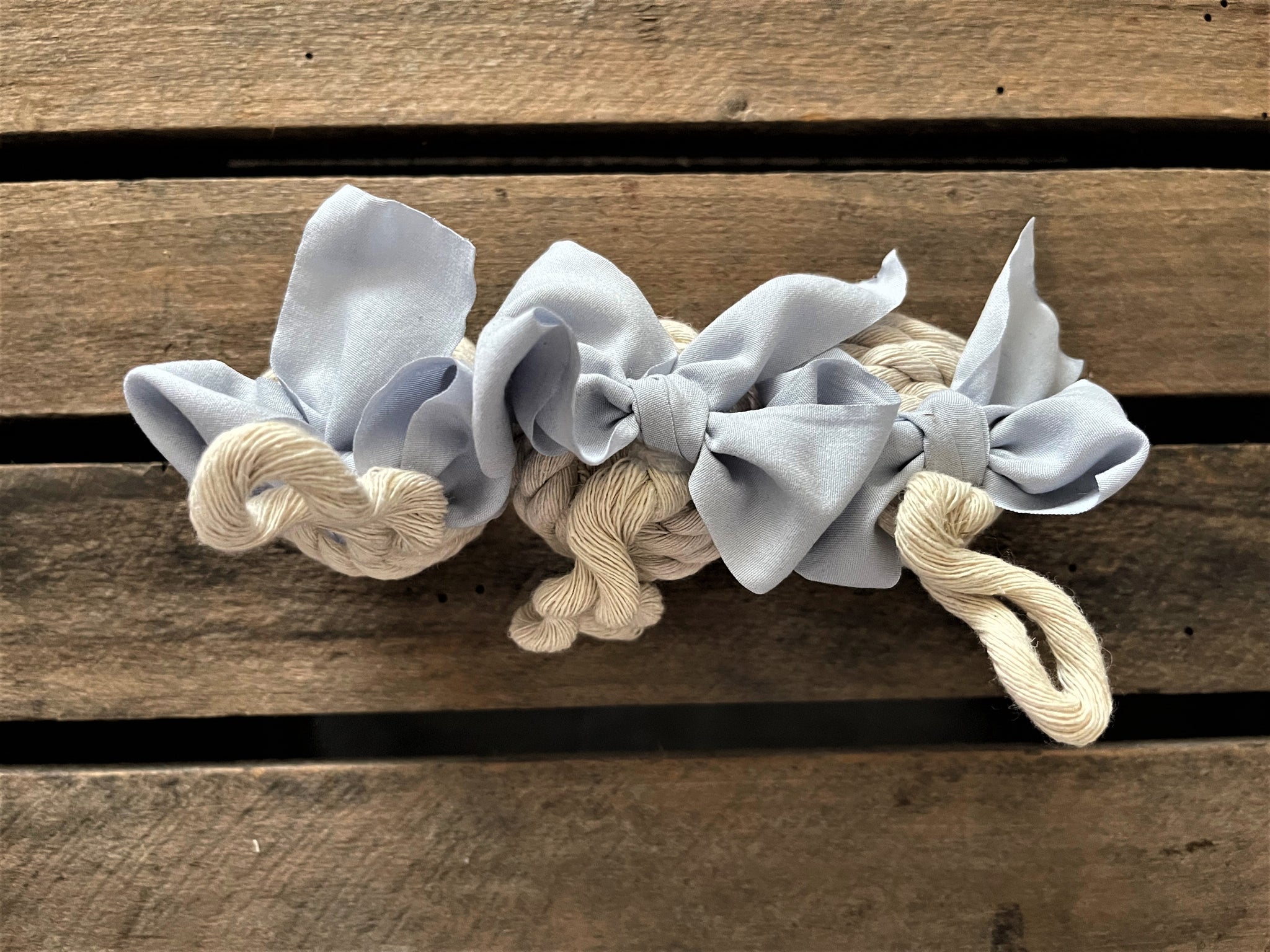 Ornaments measure 2.5 inches round. Covered in white nautical rope with a rope loop for hanging and accented with blue ribbon bow. Each weigh 1.6 ounces.