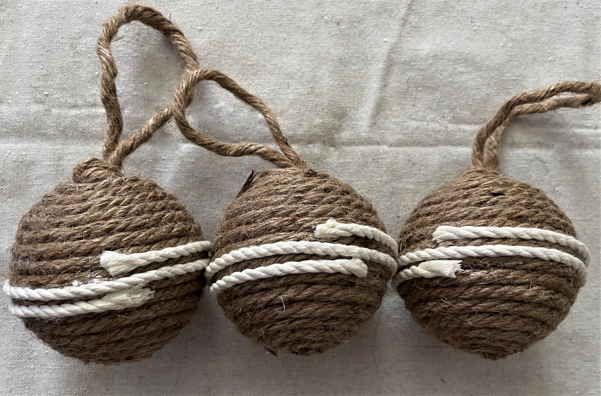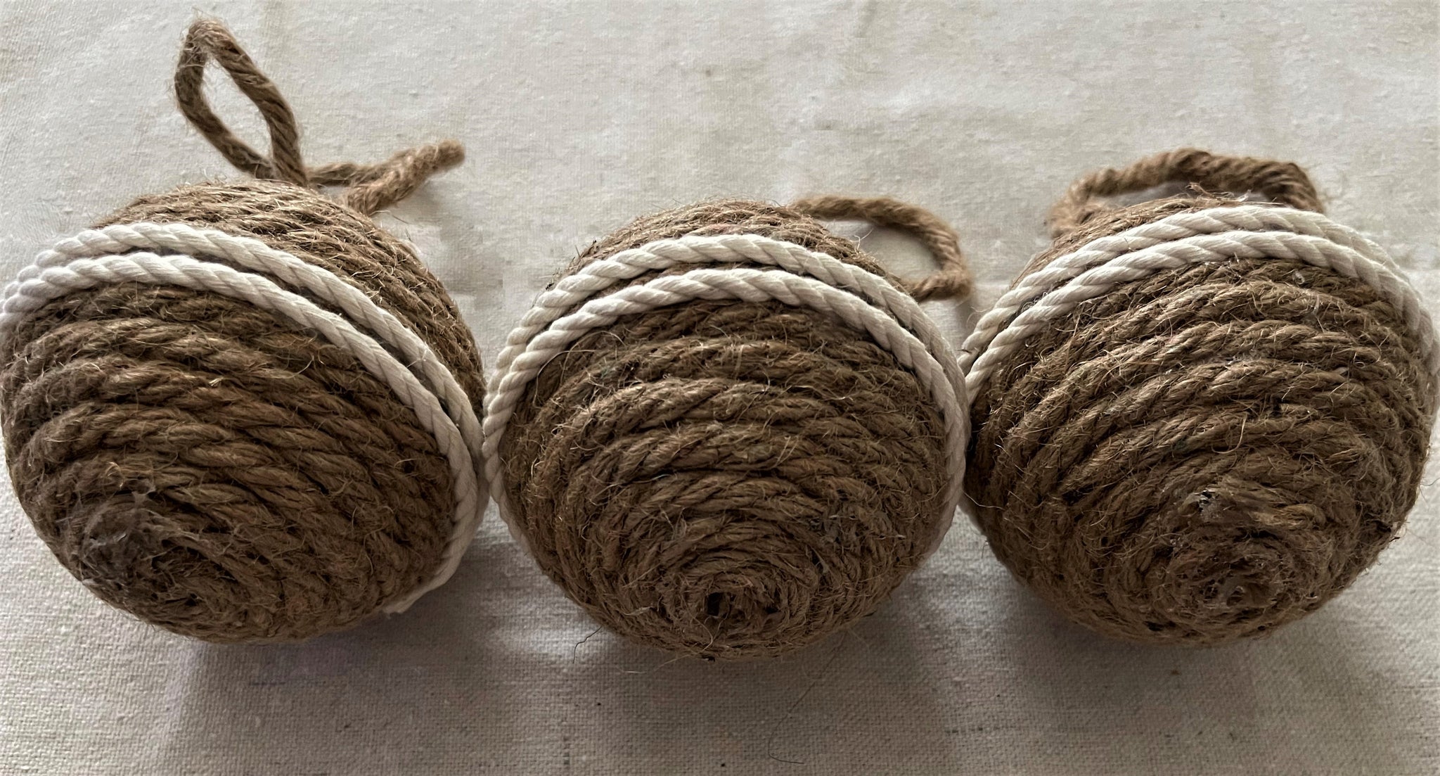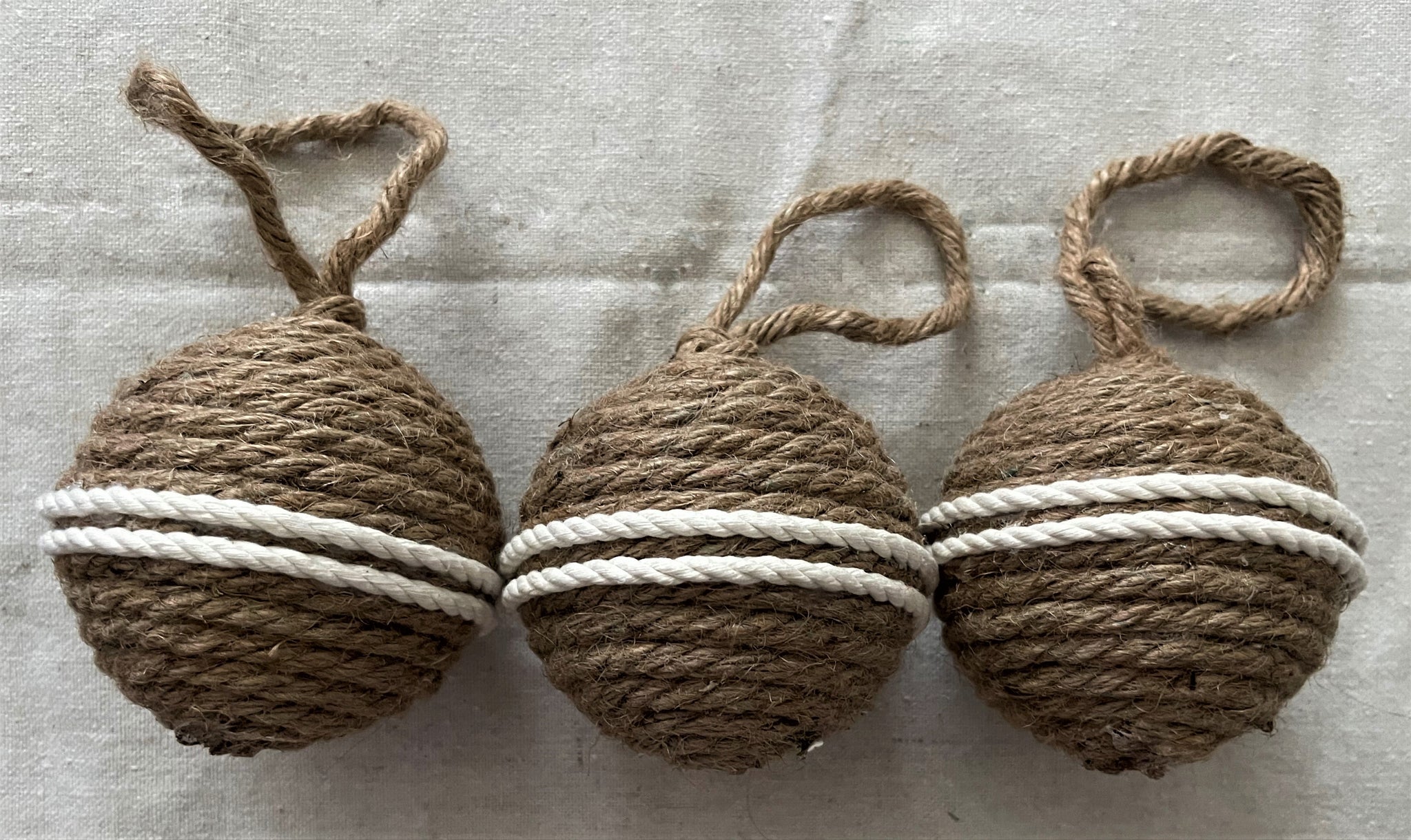 Ornaments measure 4.75 inches round. Covered in brown rope with a rope loop for hanging a accented with a double beige rope stripe around the center. Each weigh 3.2 ounces.