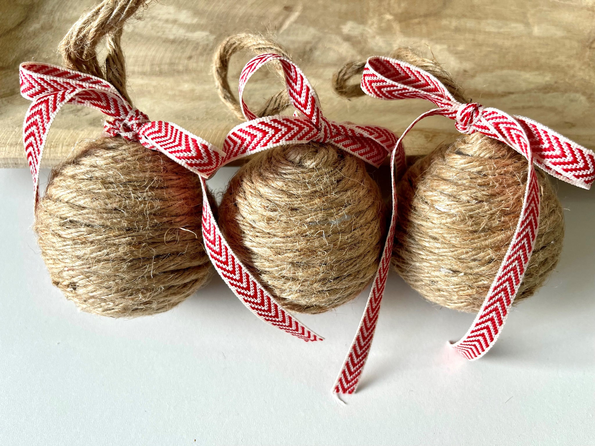 Ornaments measure 3 inches round. Covered in brown rope with a rope loop for hanging and accented with red and white ribbon bow.