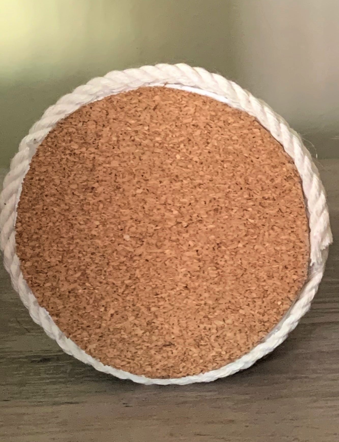 Made with beige macramé cord with a Styrofoam base and wooden ornaments. Bottom of tree is covered with cork.