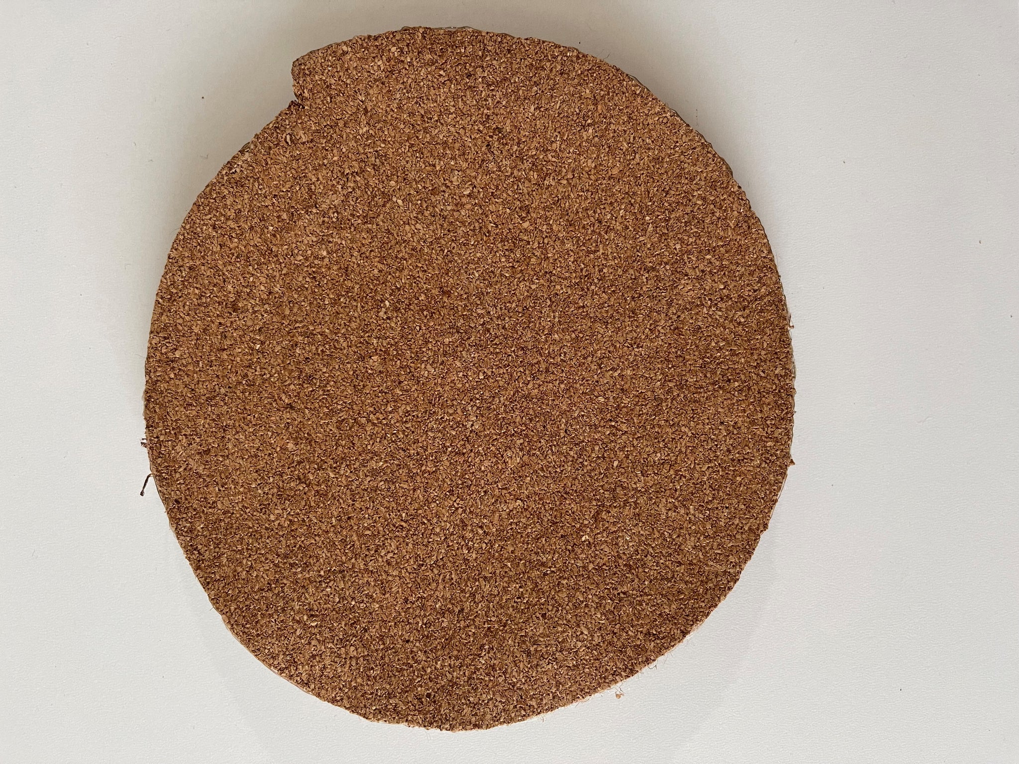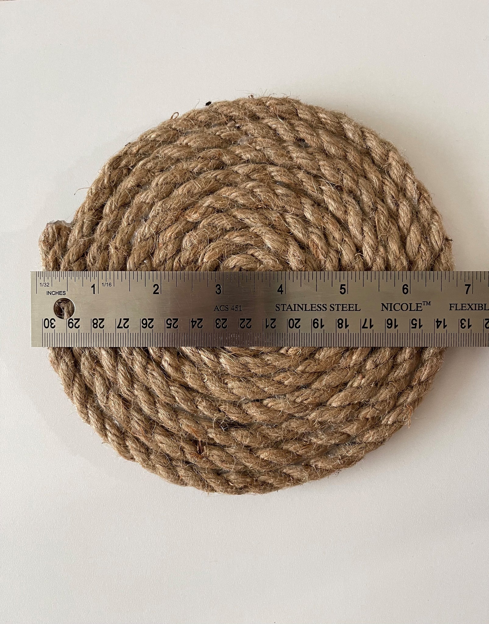 Coiled rope trivet is 6.75" in diameter, .25" thick it has a cork bottom that has been sealed.
