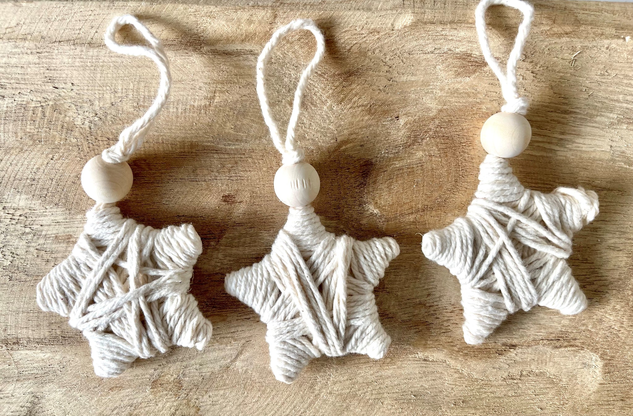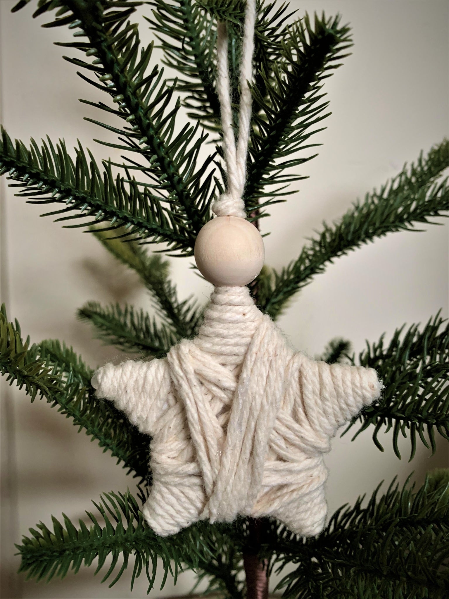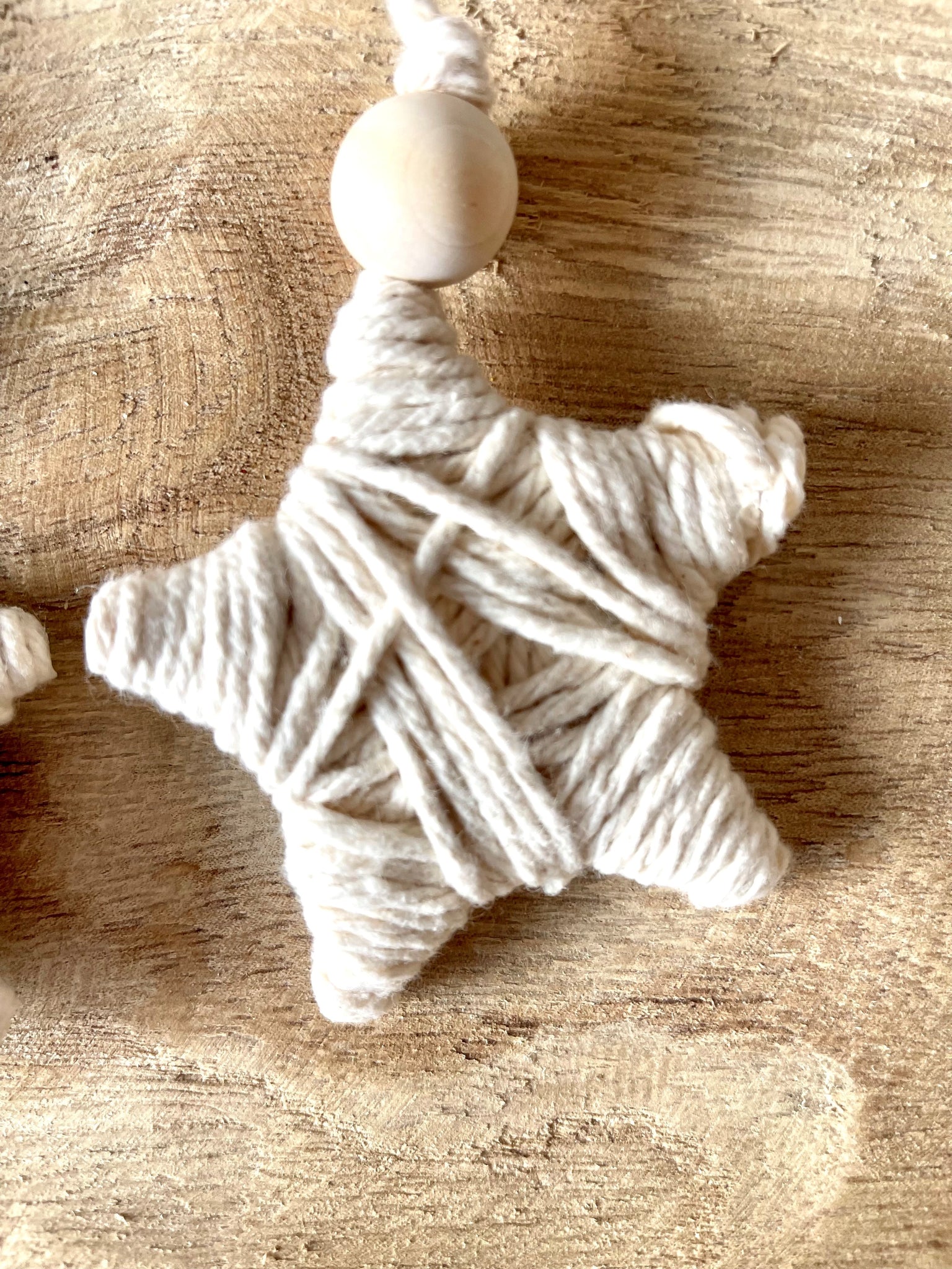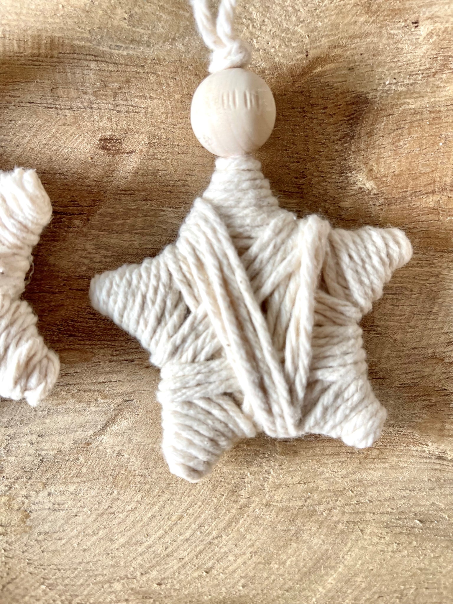 These are one of my favorite ornaments to make! The stars are made of cardboard and wrapped in cotton rope with a wood bead.