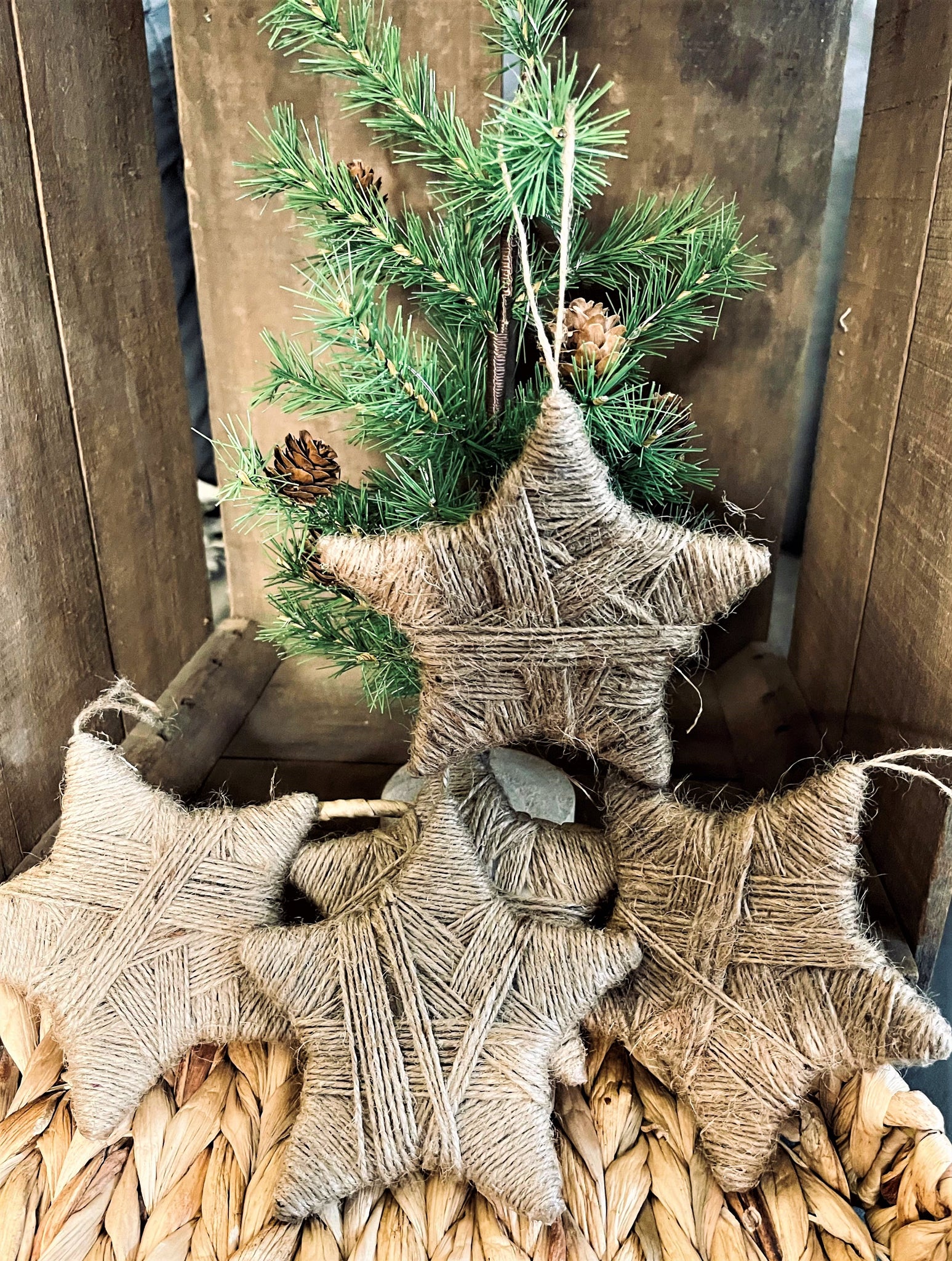 These ornaments are foam board wrapped in brown twine rope measuring 8" long and 5.25"wide the loop for hanging is 3" long.