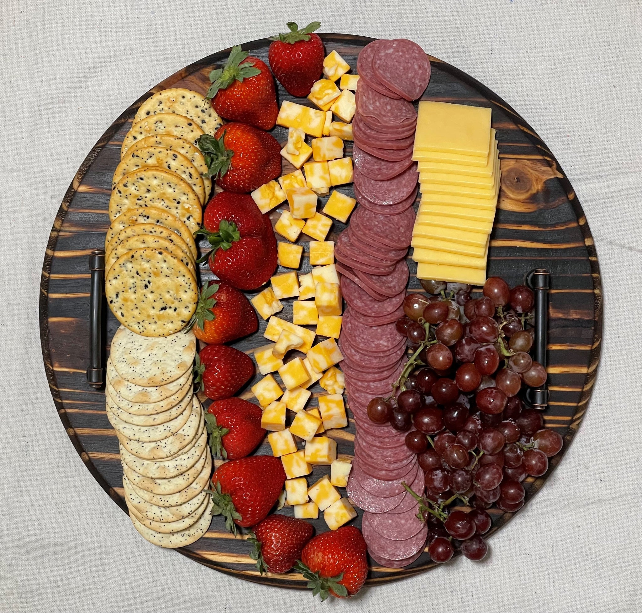 Board is made from pine and scorched to give it a burnt look along with 2 metal handles. Tray has been treated with mineral oil to keep it from drying out.