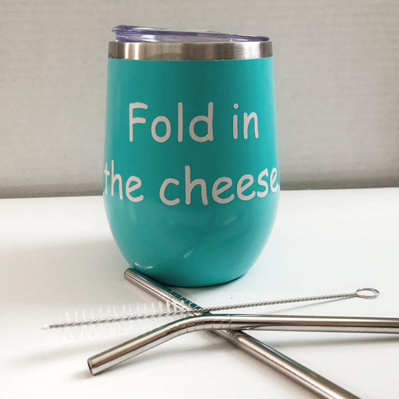Fold in the Cheese 12 ounce stainless steel tumbler can be wine, coffee or any drink you choose. Tumbler comes with two straws one bent and one straight and a cleaning brush for the straws.
