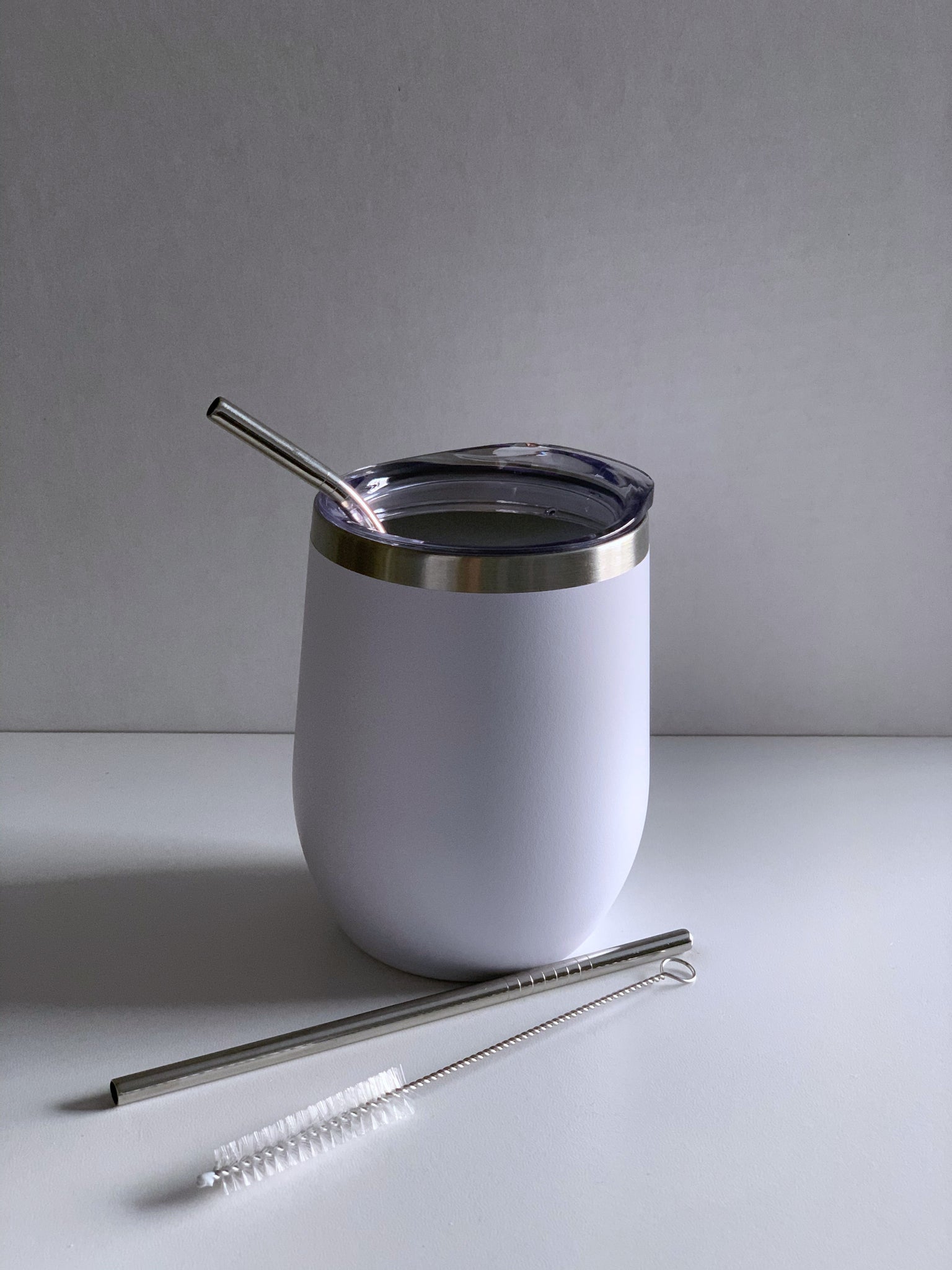 Ew, David stainless steel tumbler can be used with wine, coffee or any drink of choice. Tumbler comes with 2 straws one bent and one straight and a brush to clean the straws.