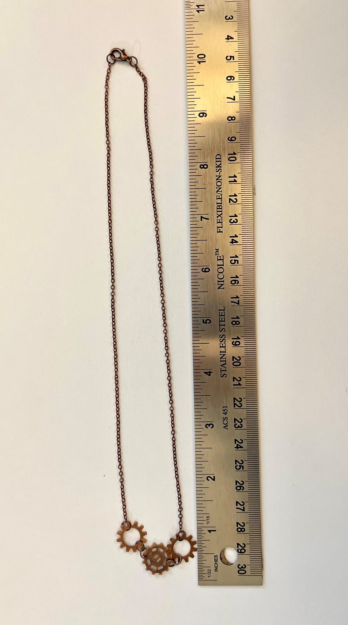 Gear necklace is made from 3 copper gears on a copper chain. This unique necklace is very light.