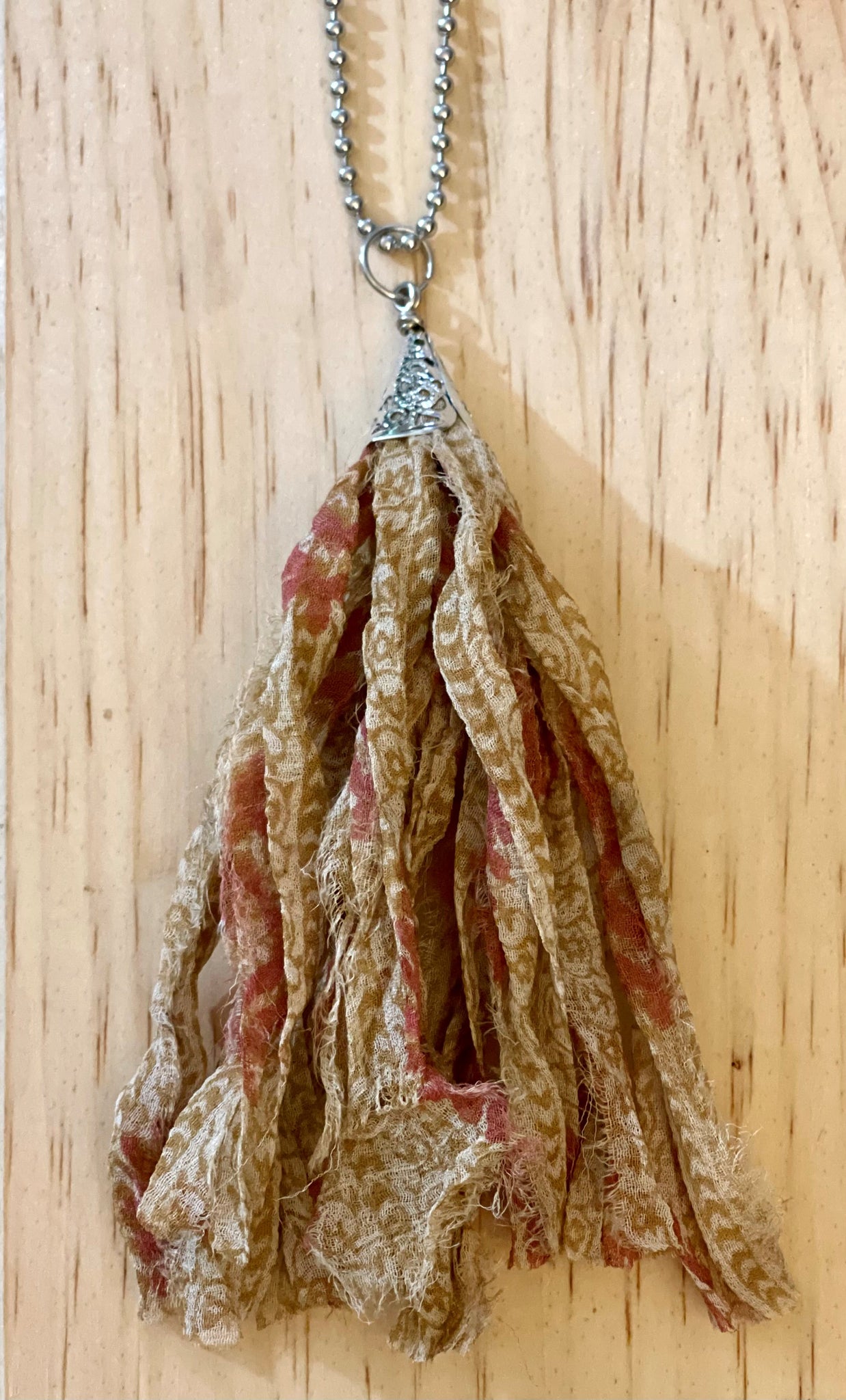 Tassel is made from recycled silk sari and chain is made from stainless steel. The necklace in the picture is the one you will receive.