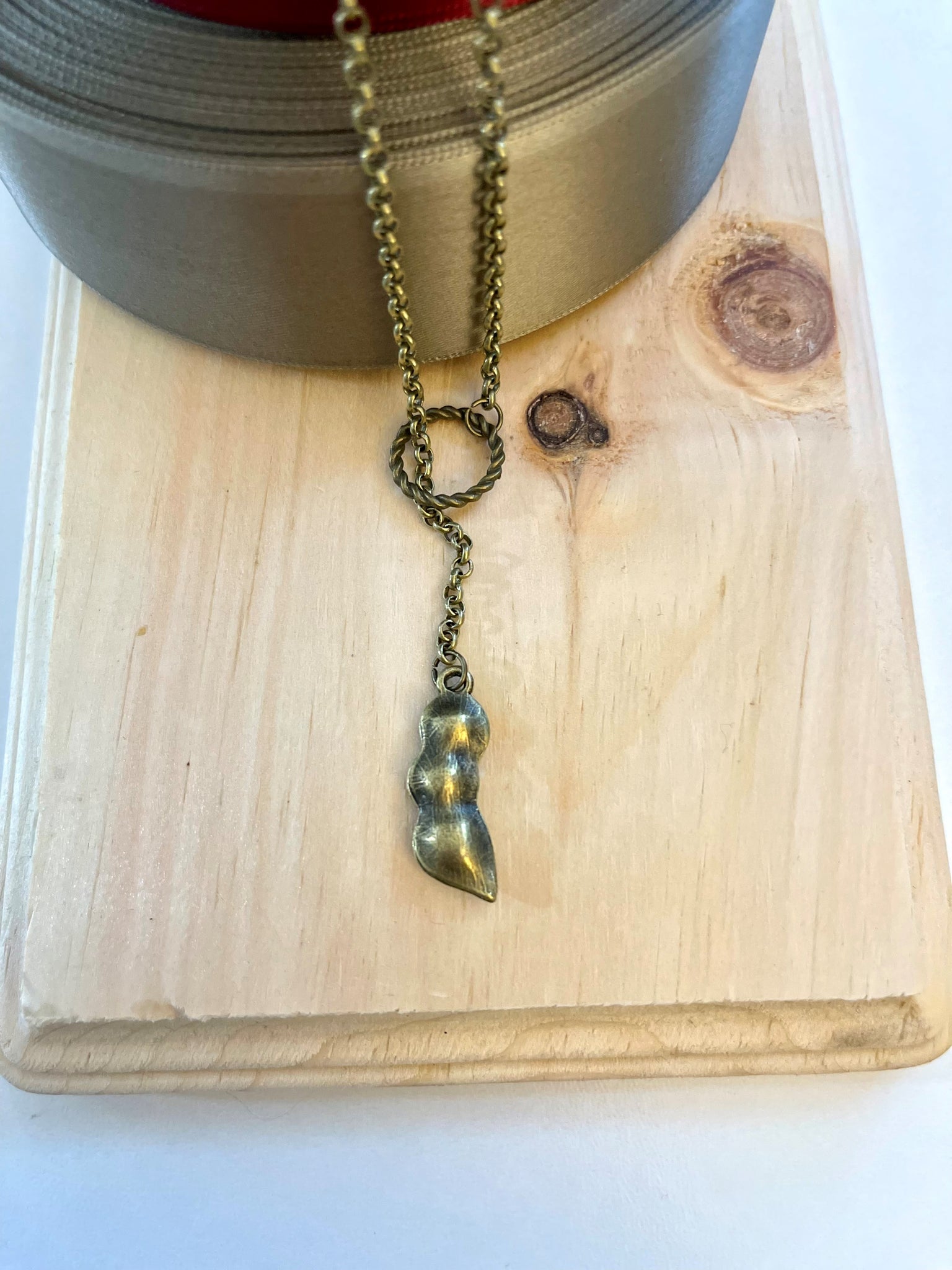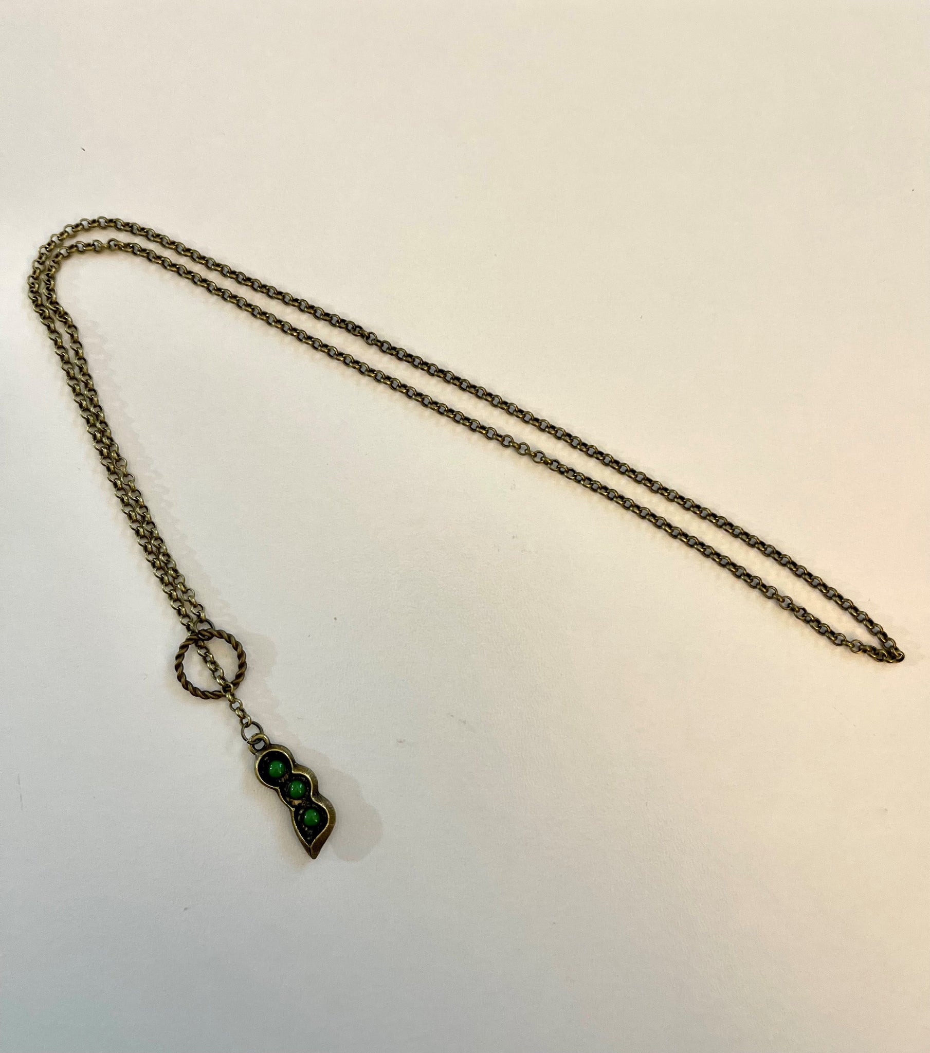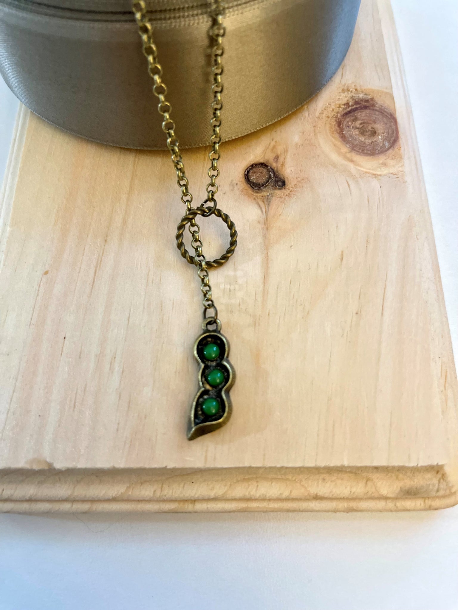 Three peas in a pod necklace made from antique brass chain, charm is made from brass with green enameled peas with a brass ring.