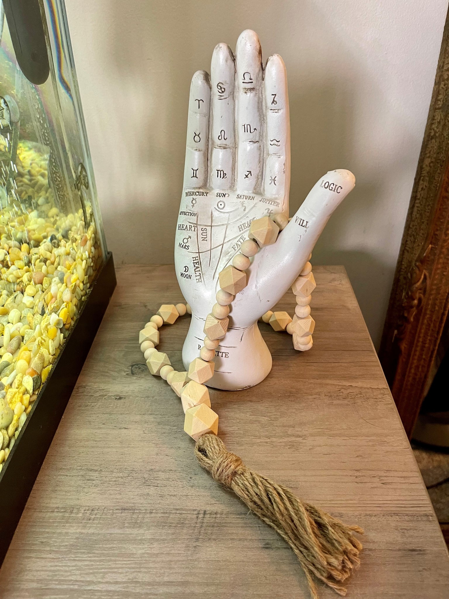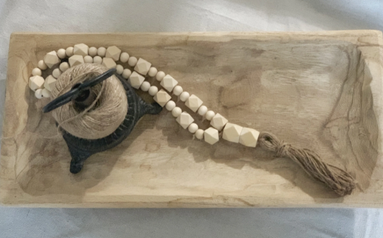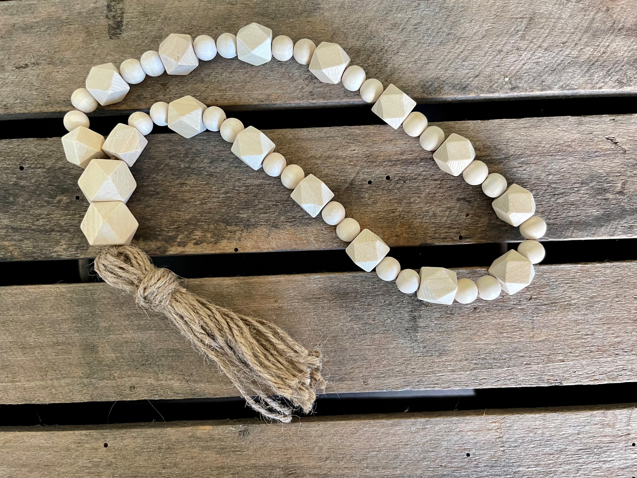 Natural wood bead garland measures 17.50 inches long and half inch wide with jute rope tassels.