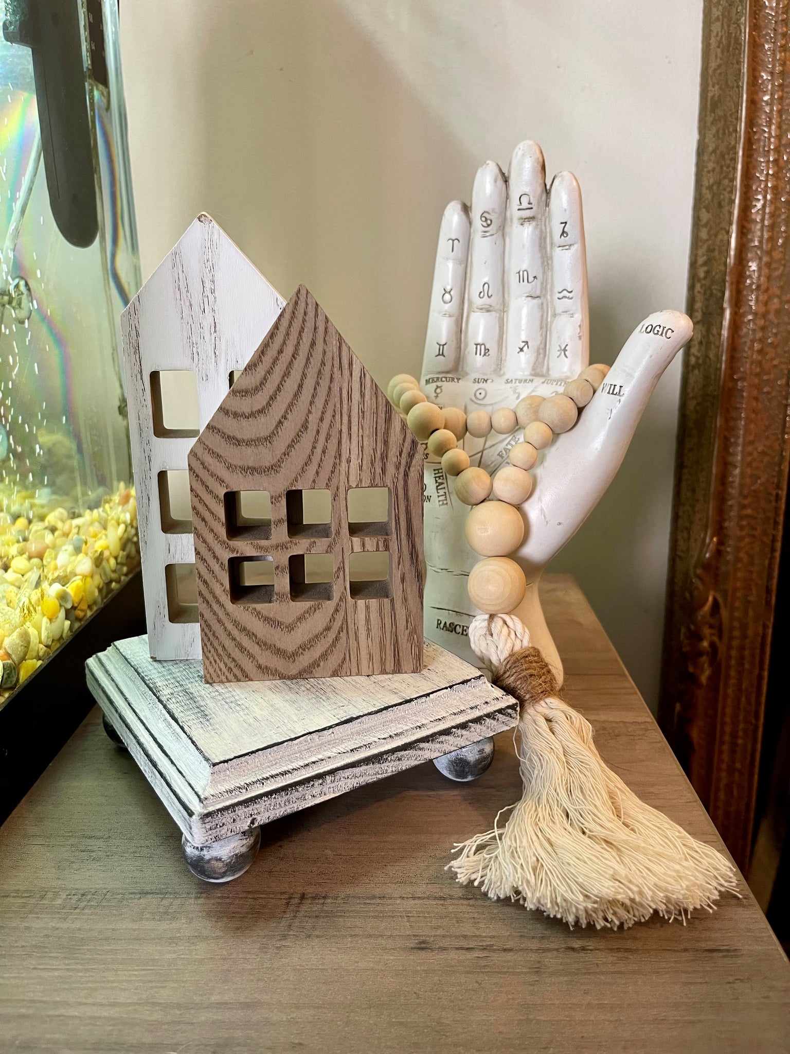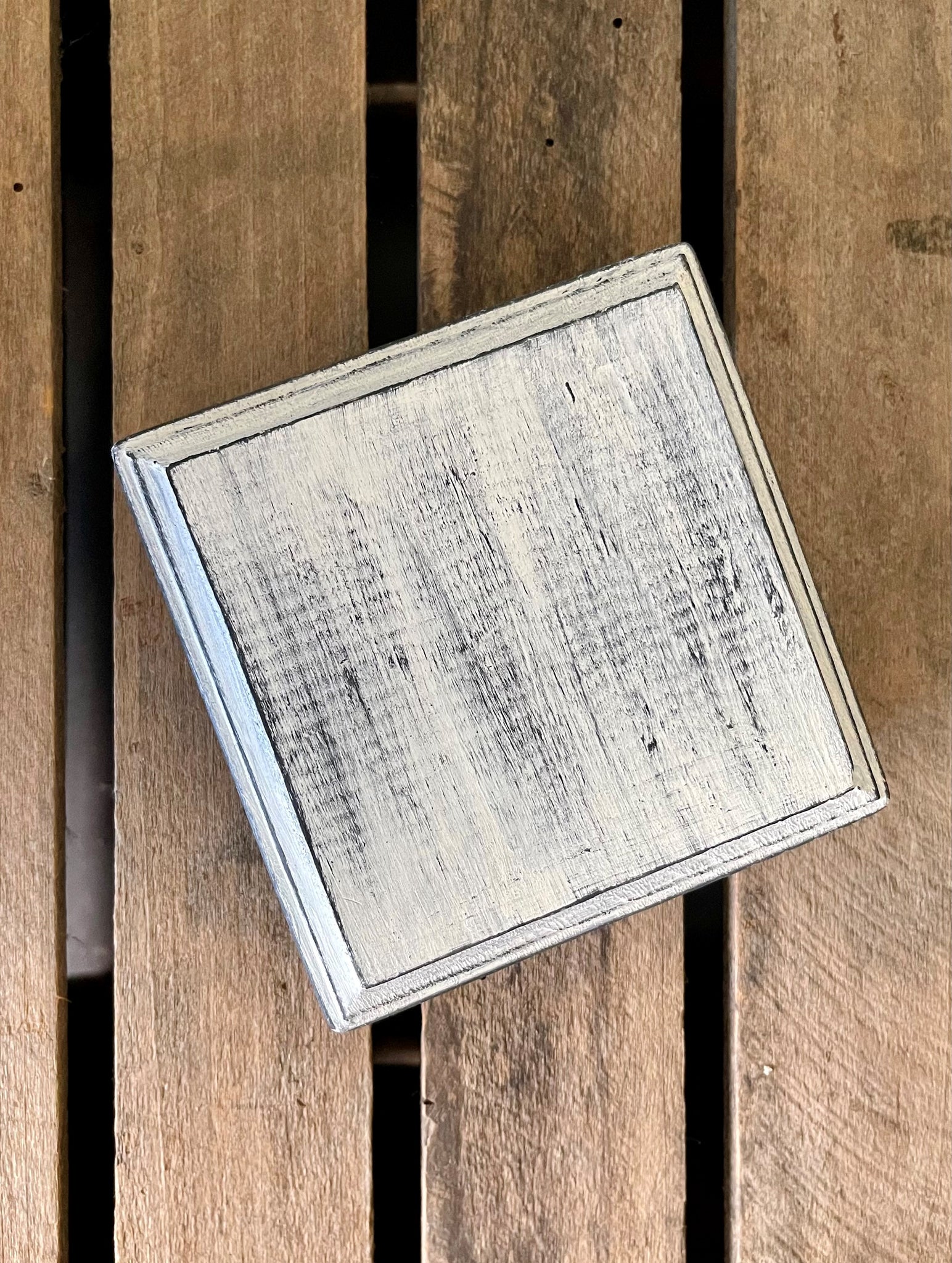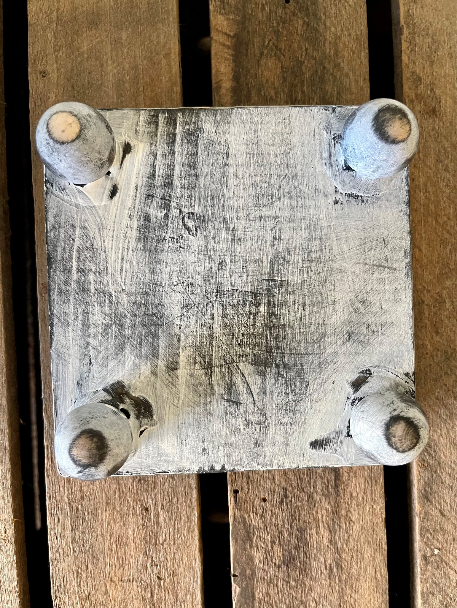 Wood riser is handmade by myself. Feet are glued to base, painted with 2 coats of black chalkboard paint then dry brushed with beige paint then sanded with sandpaper to give a worn farmhouse look.