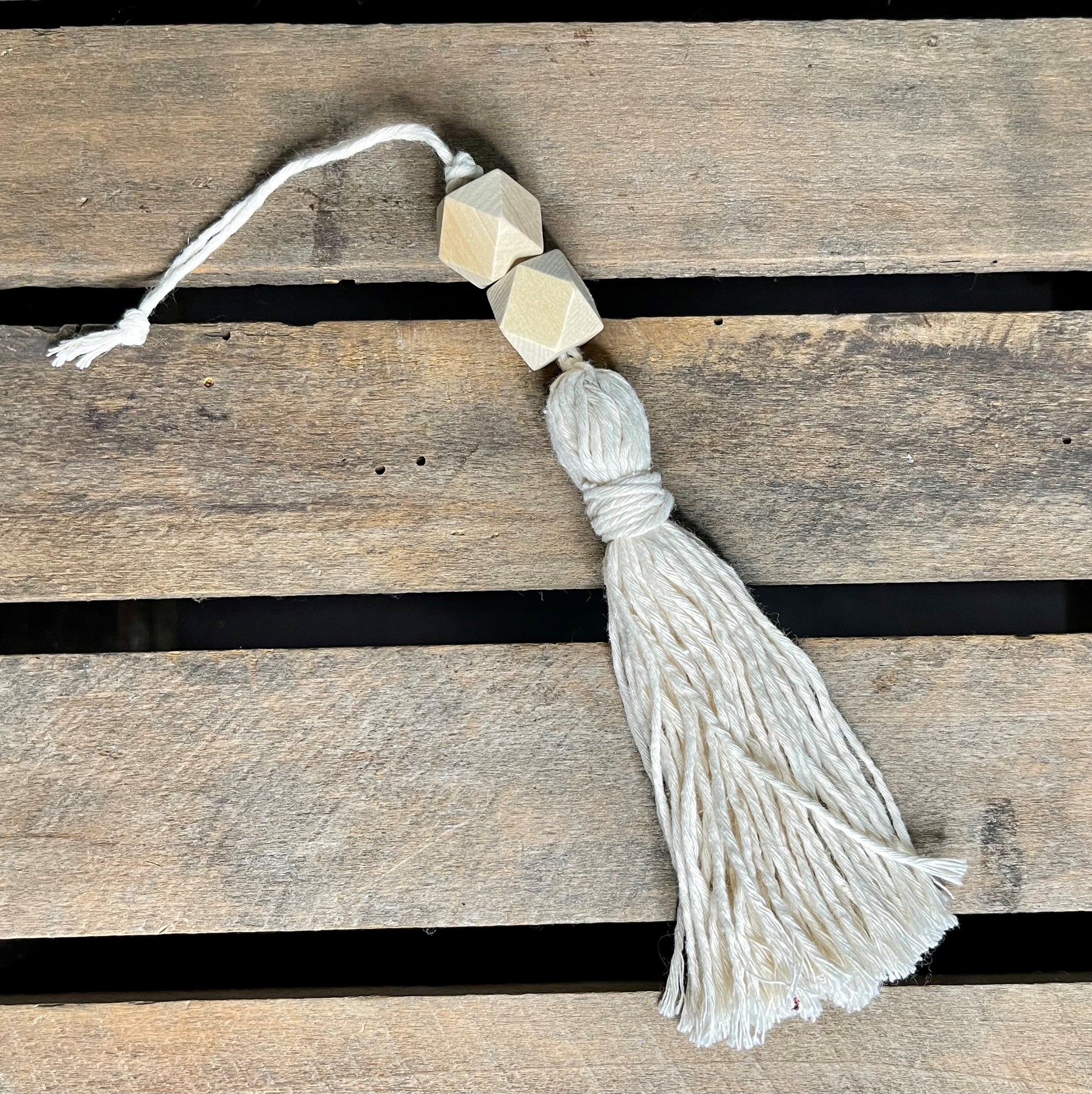 This rope tassel is adorned with two hexagon shaped wooden beads and is 1.75 inches long and .75 inches wide at the widest part.