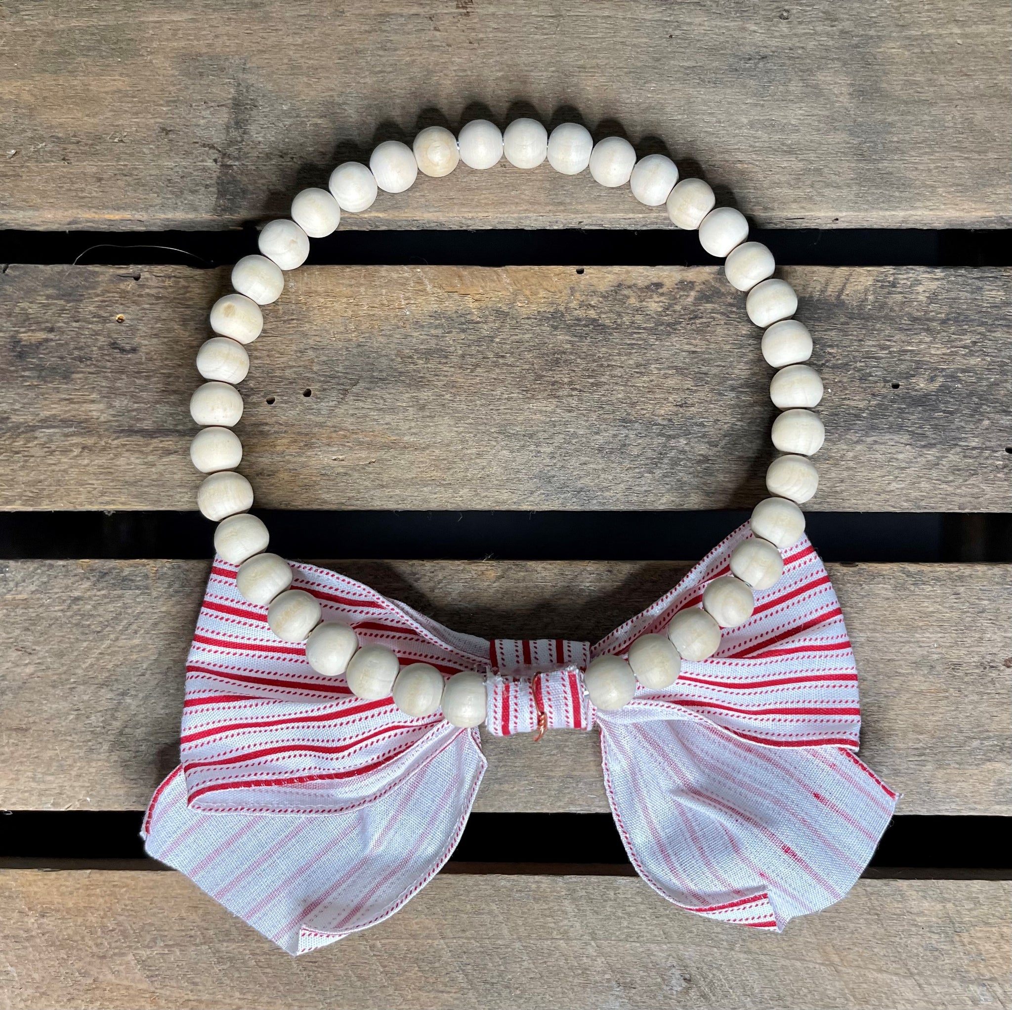 Natural Wood Bead Wreath with Read and White Stripe Bow