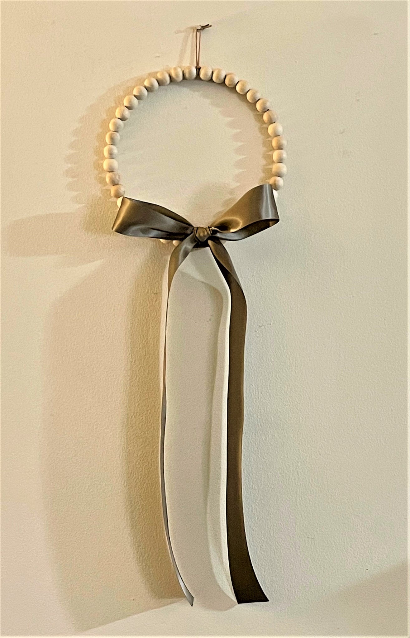 Natural Wood Bead Wreath with Silk Brown Ribbon