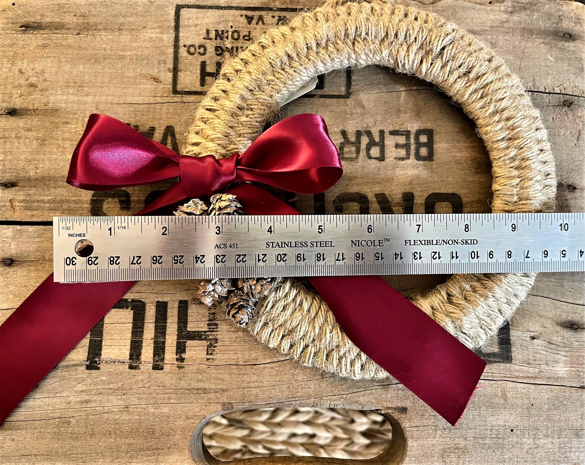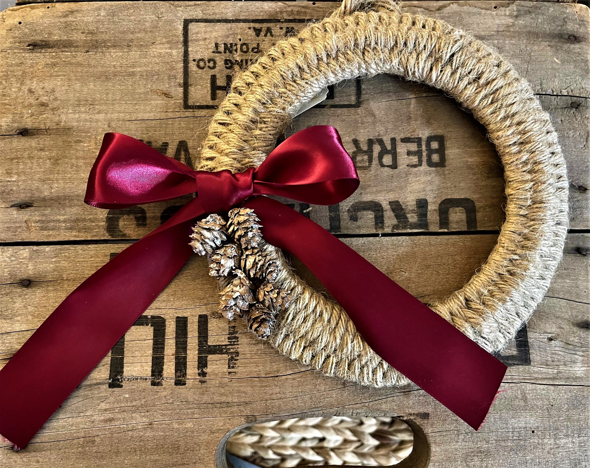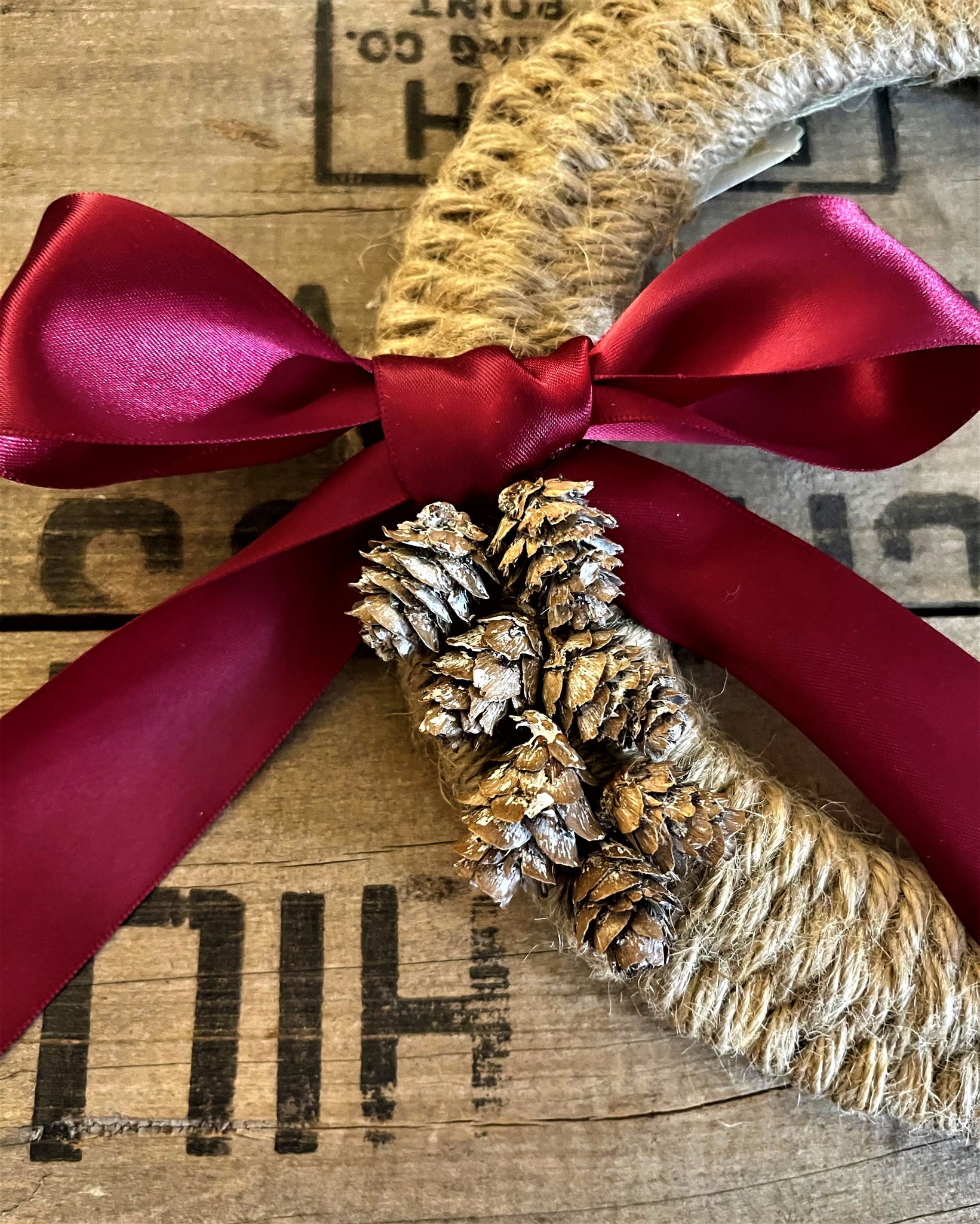 Brown woven rope wreath is accented with mini pine cones and a silk red ribbon bow.
